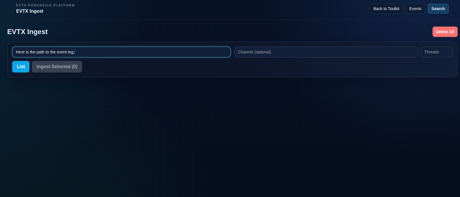 3. 在 `EVTX folder path` 中,输入您的 EVTX 目录(例如 `event_log` 或绝对路径)。