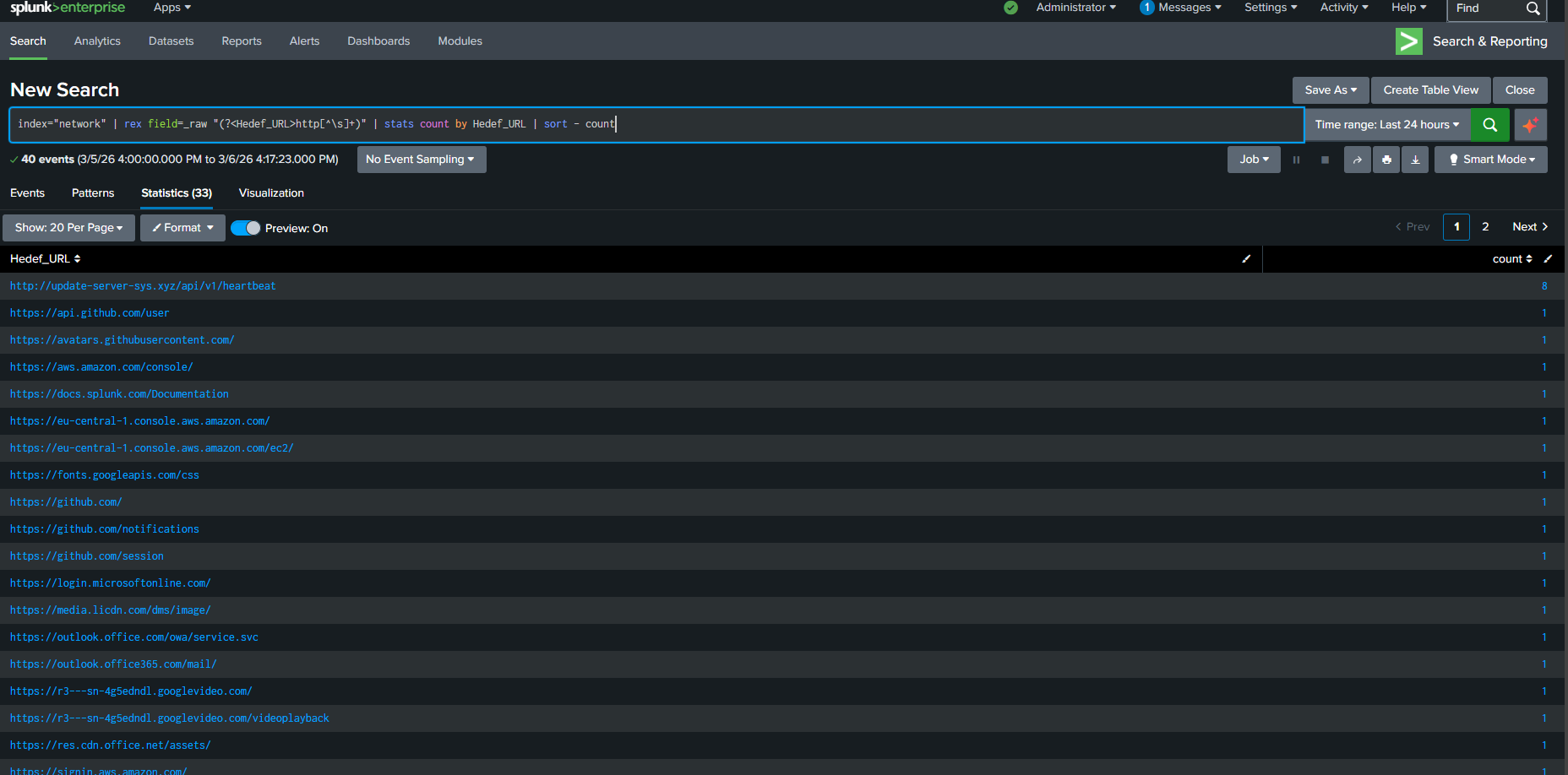 C2 sunucusunu IP veya domain (alan adı) bilgisi olmadan bulabilmek için, Regex (`rex`) kullanarak dışarıya giden tüm HTTP isteklerini dinamik olarak çıkaran gelişmiş bir SPL sorgusu yazdım. Ardından, anormal frekans kalıplarını belirleyip sıralamak için istatistiksel komutlar (`stats count`) uyguladım.