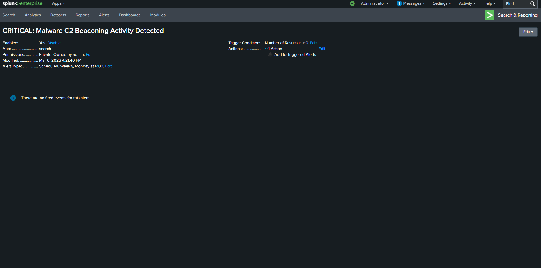 一旦识别出恶意 C2 域名,我设计了一个高严重性告警,以便在将来任何连接到此基础设施时自动触发,从而允许 SOC 团队立即隔离受感染的端点。