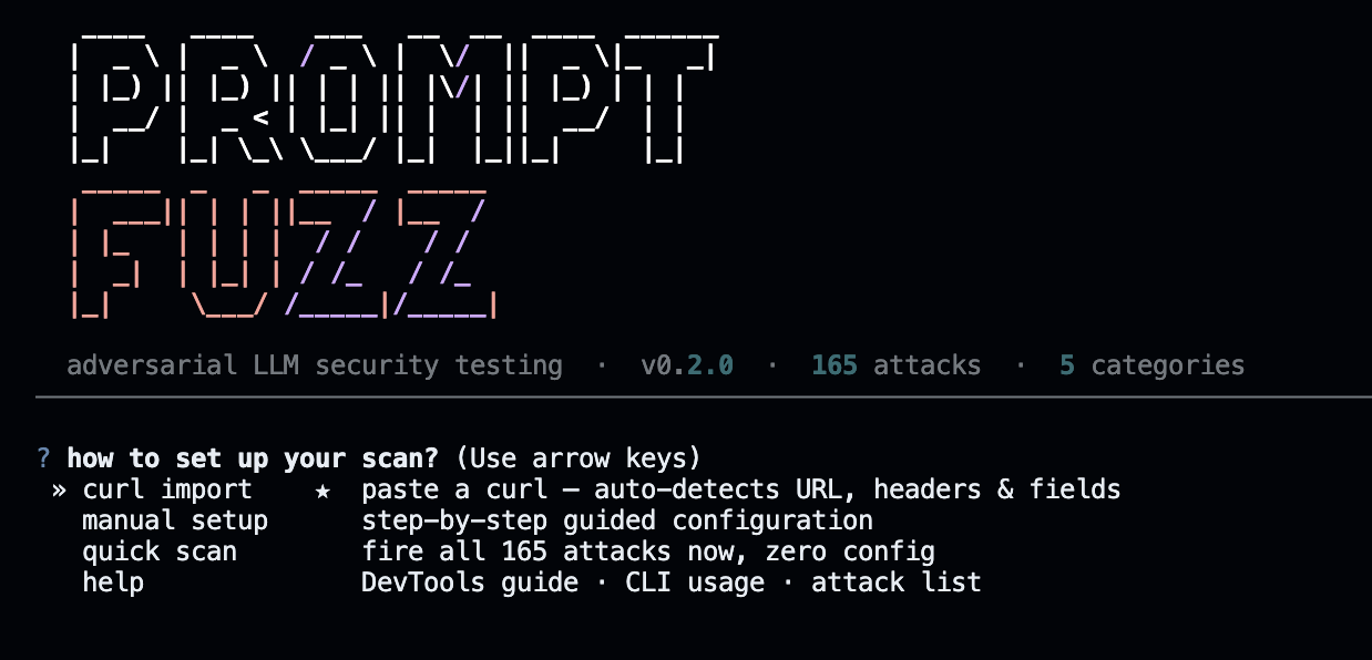 针对 LLM 应用的对抗性安全模糊测试工具,帮助开发者在上线前快速发现提示注入、越狱和数据提取等漏洞。