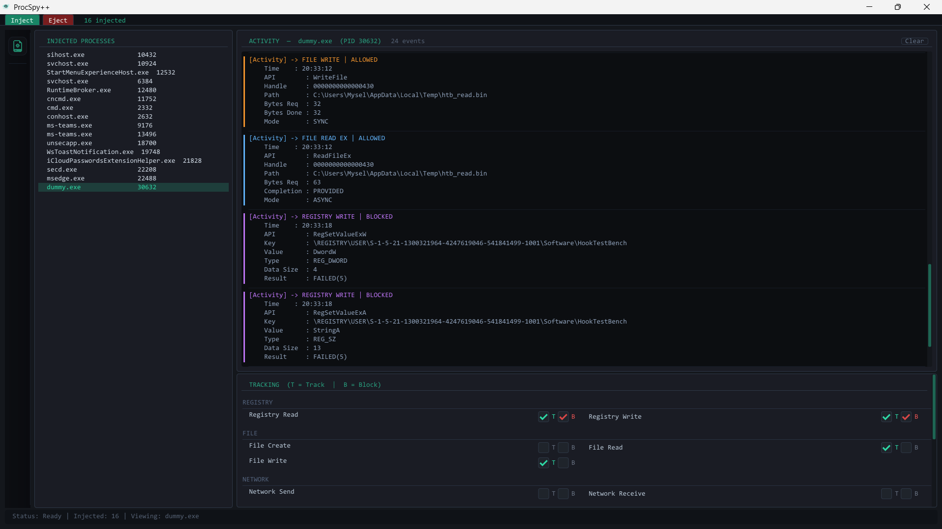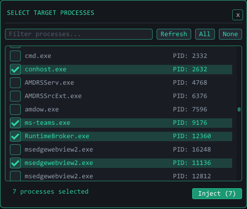 按名称筛选,勾选你的目标旁边的复选框,点击 **Inject**。该进程会出现在左侧面板中 —— 间谍 DLL 现已在其内部运行。