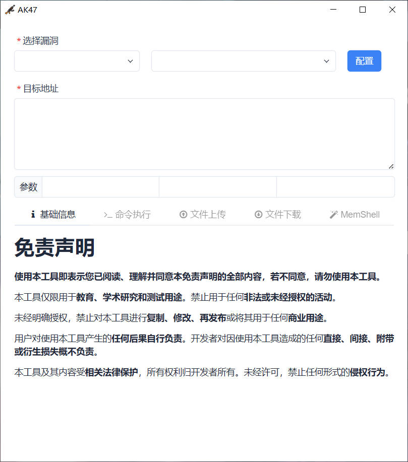 AK47 是一款跨平台的漏洞利用与安全评估工具,内置高级引擎与多种安全扩展模块,致力于显著提升安全验证的工作效率。 ## 功能特性 - **跨平台:** Windows / Linux / MacOS - **插件化:** 灵活的规则编排与语法引擎 - **AI 支持:** MCP 深度联动 + Skill 专业赋能 - **通信协议:** TCP / UDP / HTTP / WebSocket - **外部扩展:** ysoserial / Java-Chains / MemShellParty - **Agent服务:** OOB / JNDI / Service[DNS/LDAP/HTTP] ## 界面预览