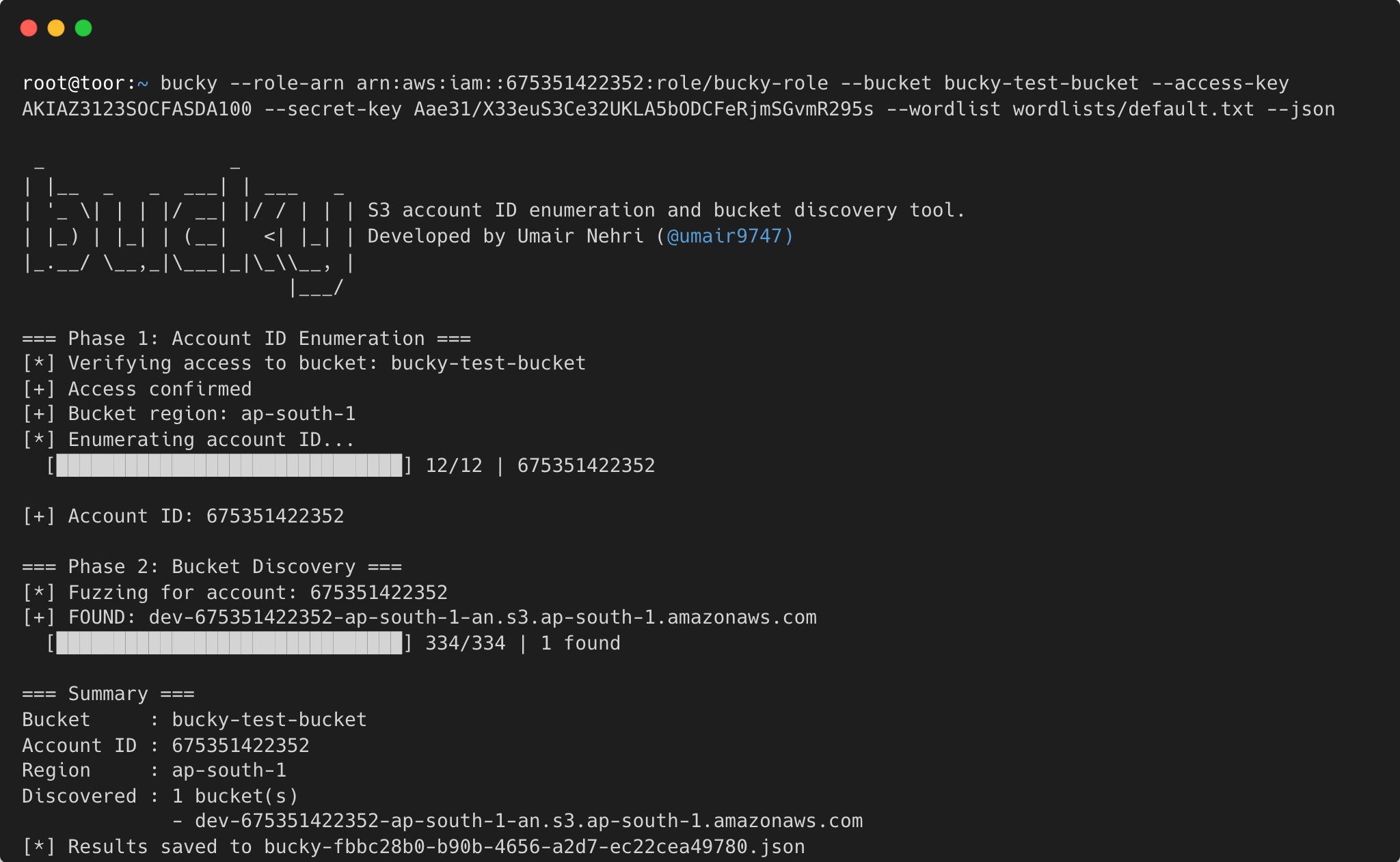 bucky --bucket target-bucket --wordlist wordlists/default.txt --json --output results.json