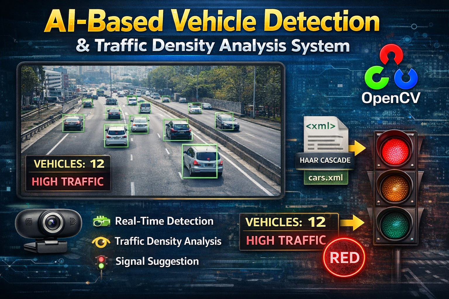 本项目是一个使用 OpenCV 和 Haar Cascade 分类器构建的实时车辆检测与交通分析系统。它能从实时的网络摄像头画面中检测车辆,并分析交通密度以提供交通信号灯状态的建议。