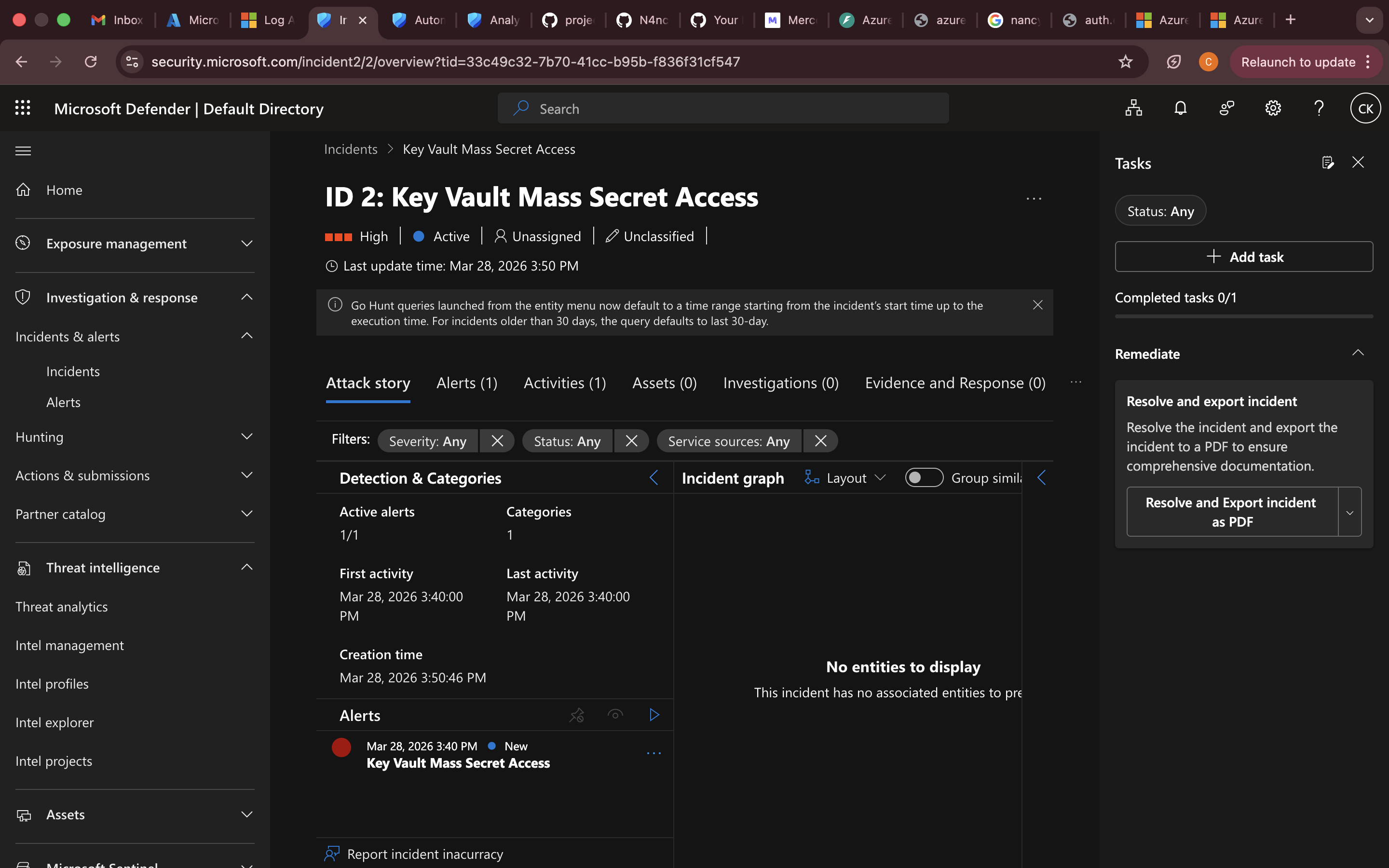深入查看 Key Vault 事件会显示警报详情、时间线和