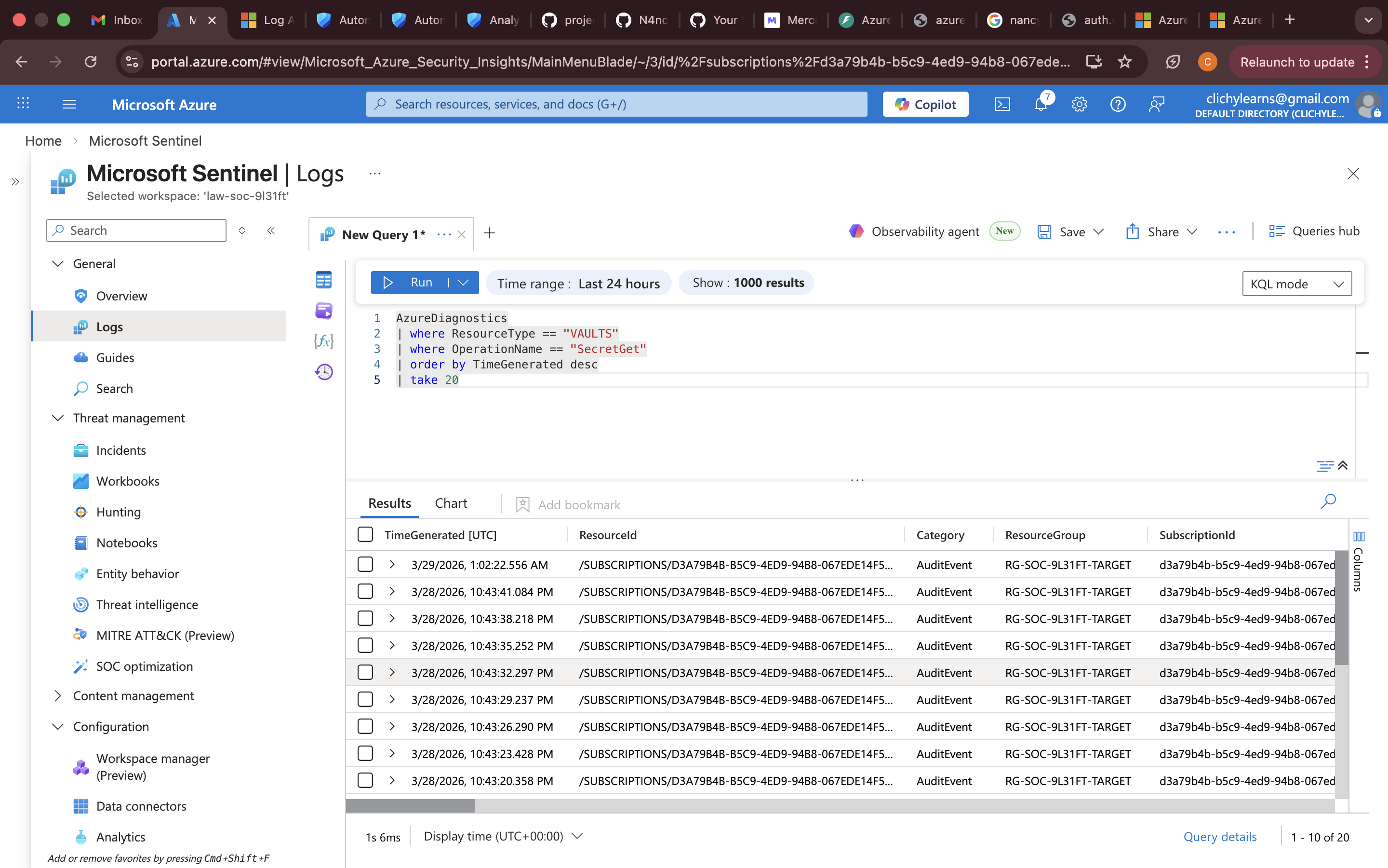 | `rg-soc-*-target` | Key Vault, 存储账户 — 被监控的工作负载 |