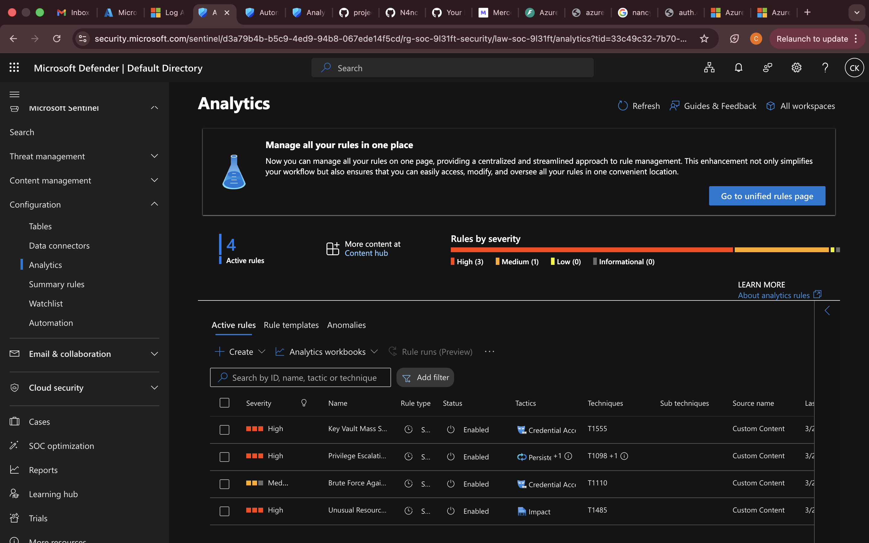 3. 在 Sentinel → Analytics 下确认分析规则是否已启用