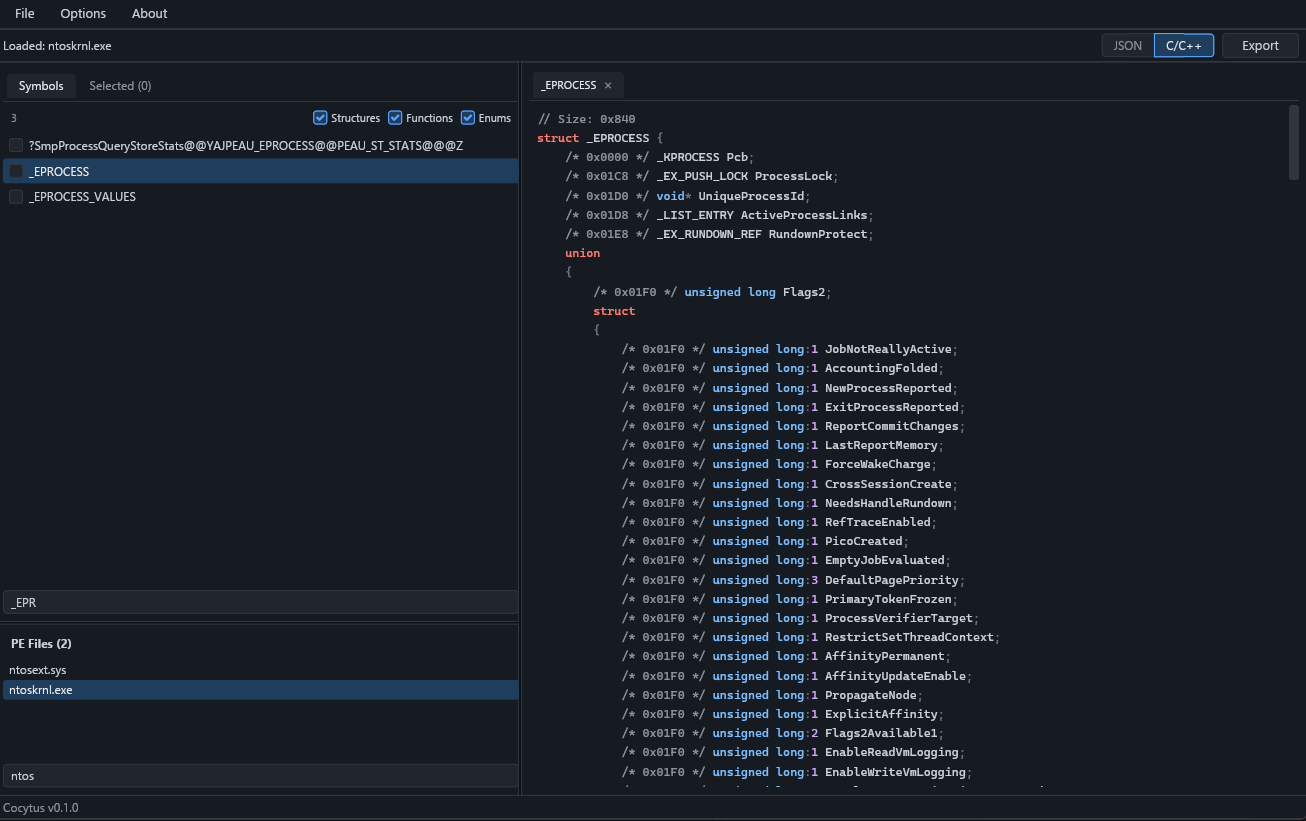 标签:0day挖掘, Cocytus, ISO解析, JSON导出, NTOSKRNL, PDB解析, PE文件分析, Rust, Windows内核, _WPROCESS, 二进制分析, 云安全监控, 云安全运维, 云资产清单, 内核安全, 内核调试, 可视化界面, 头文件生成, 白帽子, 符号提取, 结构体偏移, 网络流量审计, 逆向工程, 通知系统, 静态分析