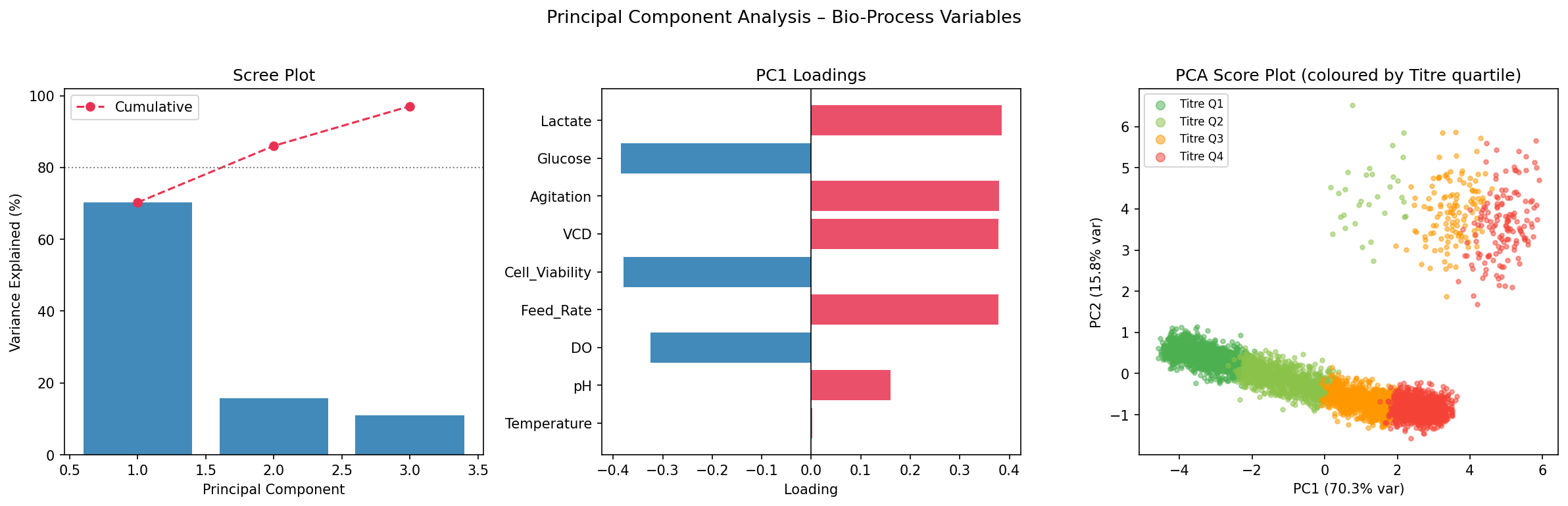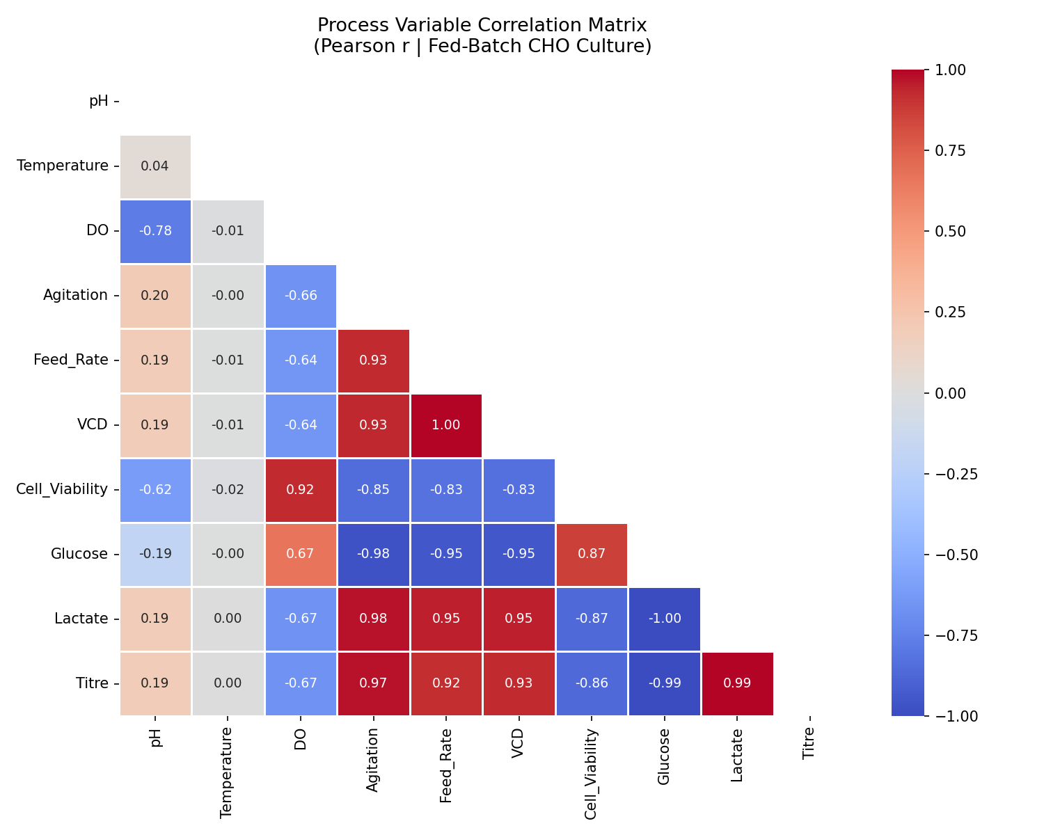 - 现实变量范围:pH 6.8–7.2,DO 5–70%,滴度 0–8 g/L,VCD 0–130 × 10⁶ cells/mL