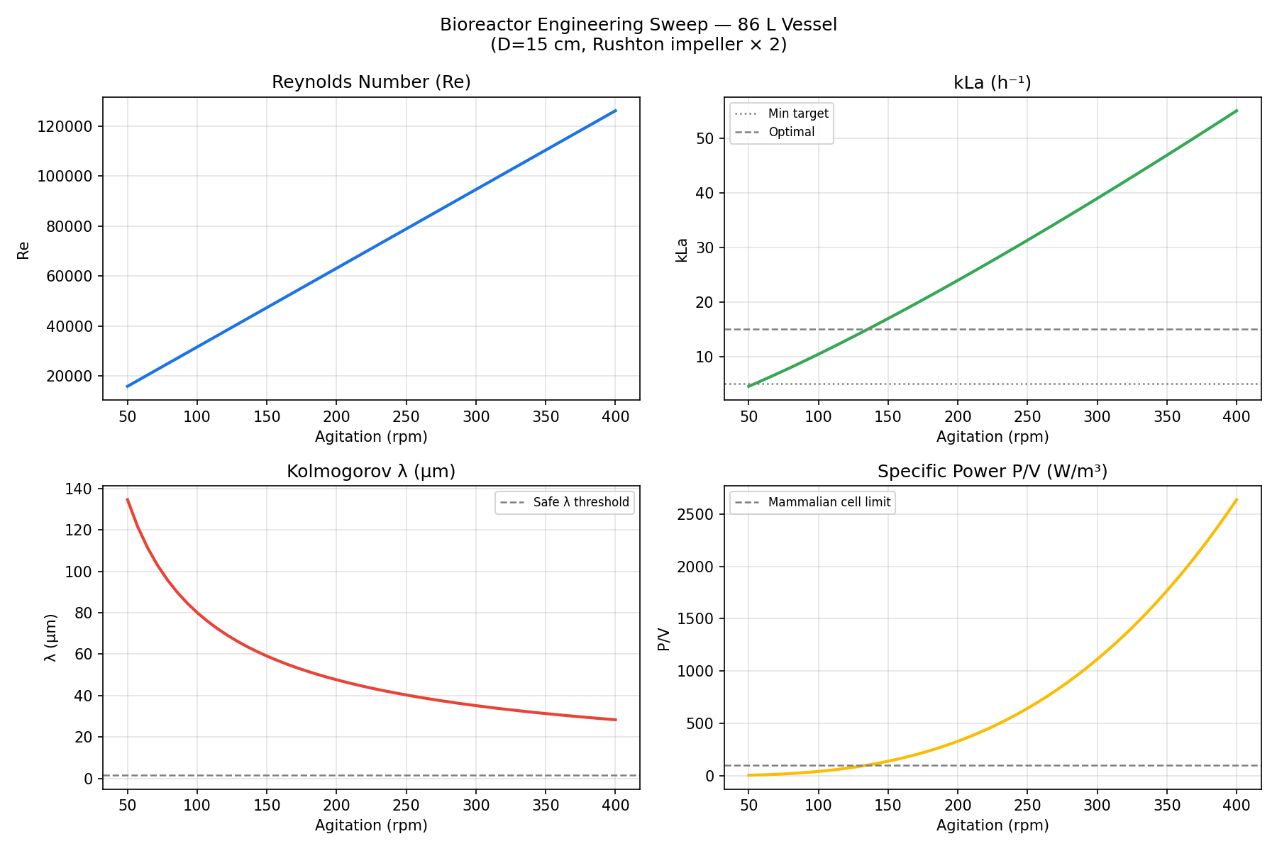 - **放大就绪** — `BioreactorGeometry` 和 `FluidState` 是数据类;从 50 L 放大到 2000 L 生产罐只需更改两个参数即可。