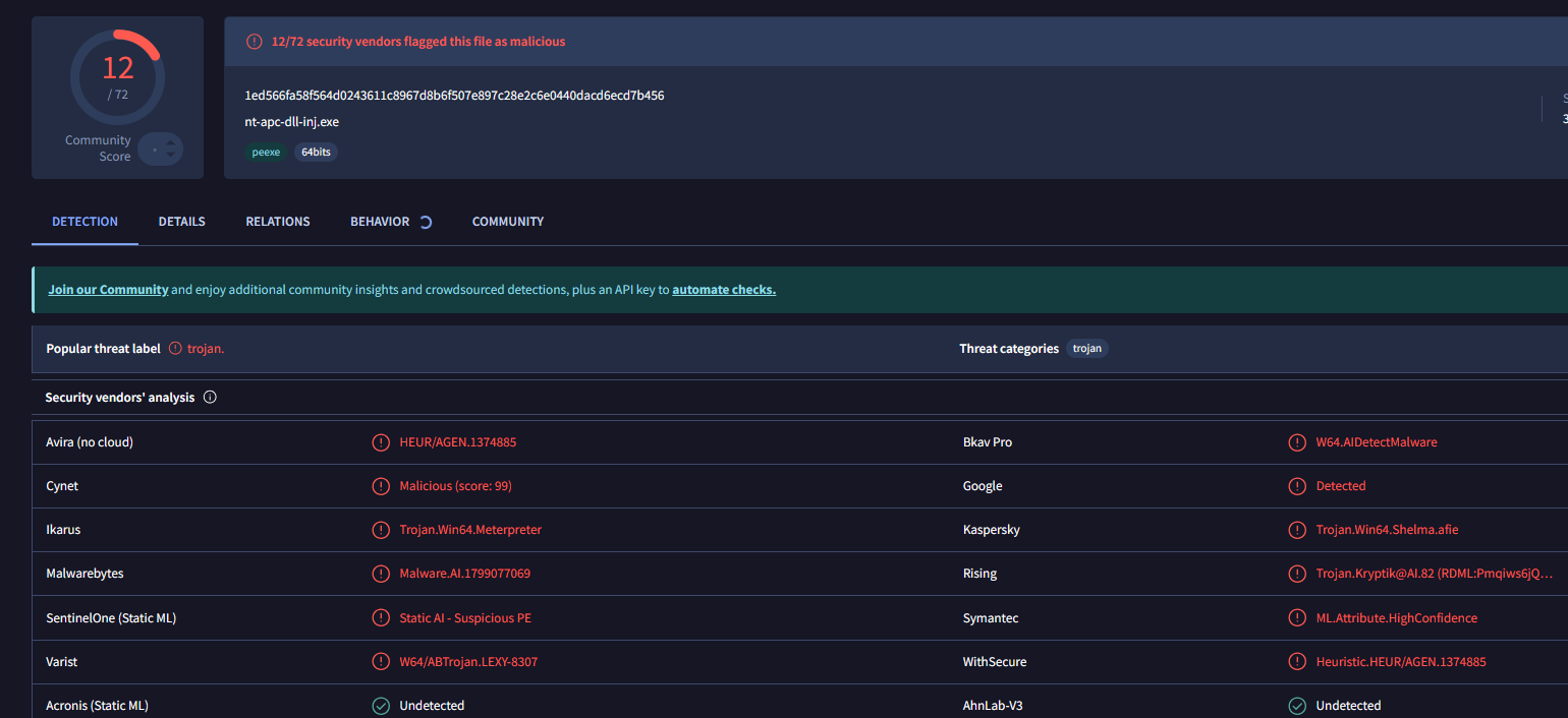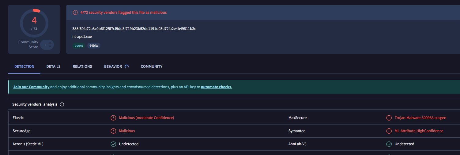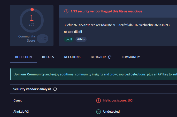 另外,我忘记从与原生 api 相关的部分中移除一些无用的函数了,比如 `NtCreateThreadEx` 或 `NtGetThreadContext`,因为我从 `injection.h`(我之前仓库的一部分)中提取了大部分的 `apc.h`,所以你应该移除它们,以减少从 ntdll 解析的函数数量,从而提高隐蔽性。正如你所见,我在每段代码旁边都标明了其原始可执行文件在 VirusTotal 上的检出率。