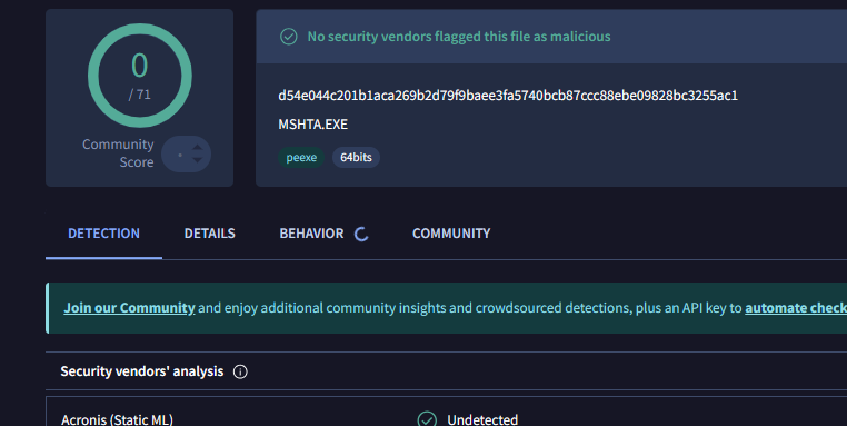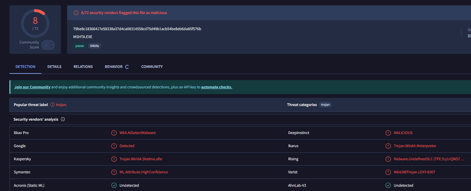 会被 BitDefender Advanced Thread Defense 拦截,但通常能绕过 Windows Defender。以下是具有混淆元数据的可执行文件的检出情况,第一个是 dll 注入器的检出,第二个是经典注入器和 dll 版本的检出。使用 Windows 默认应用程序的元数据可以将检出率降至 0,如这里使用 Mshta.exe 所示