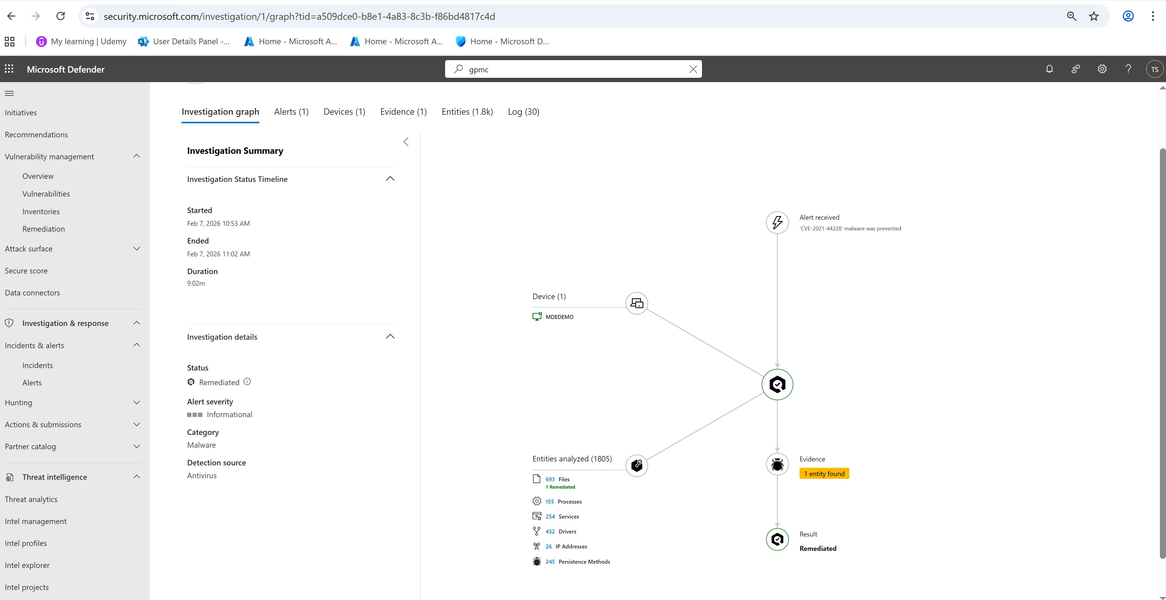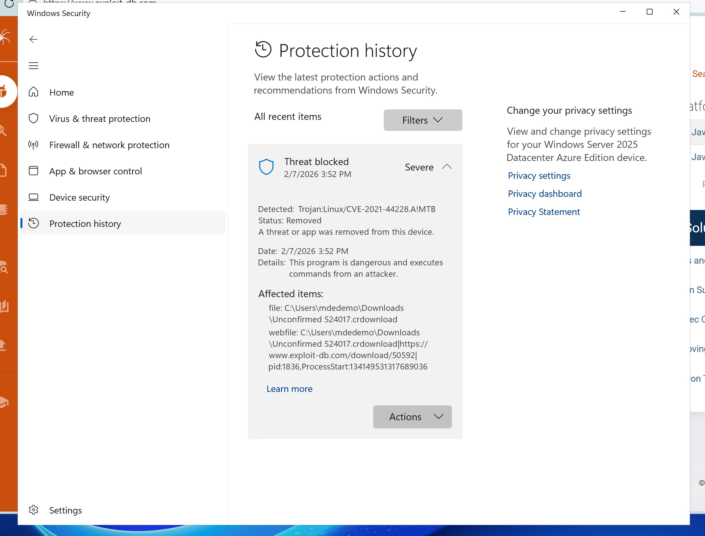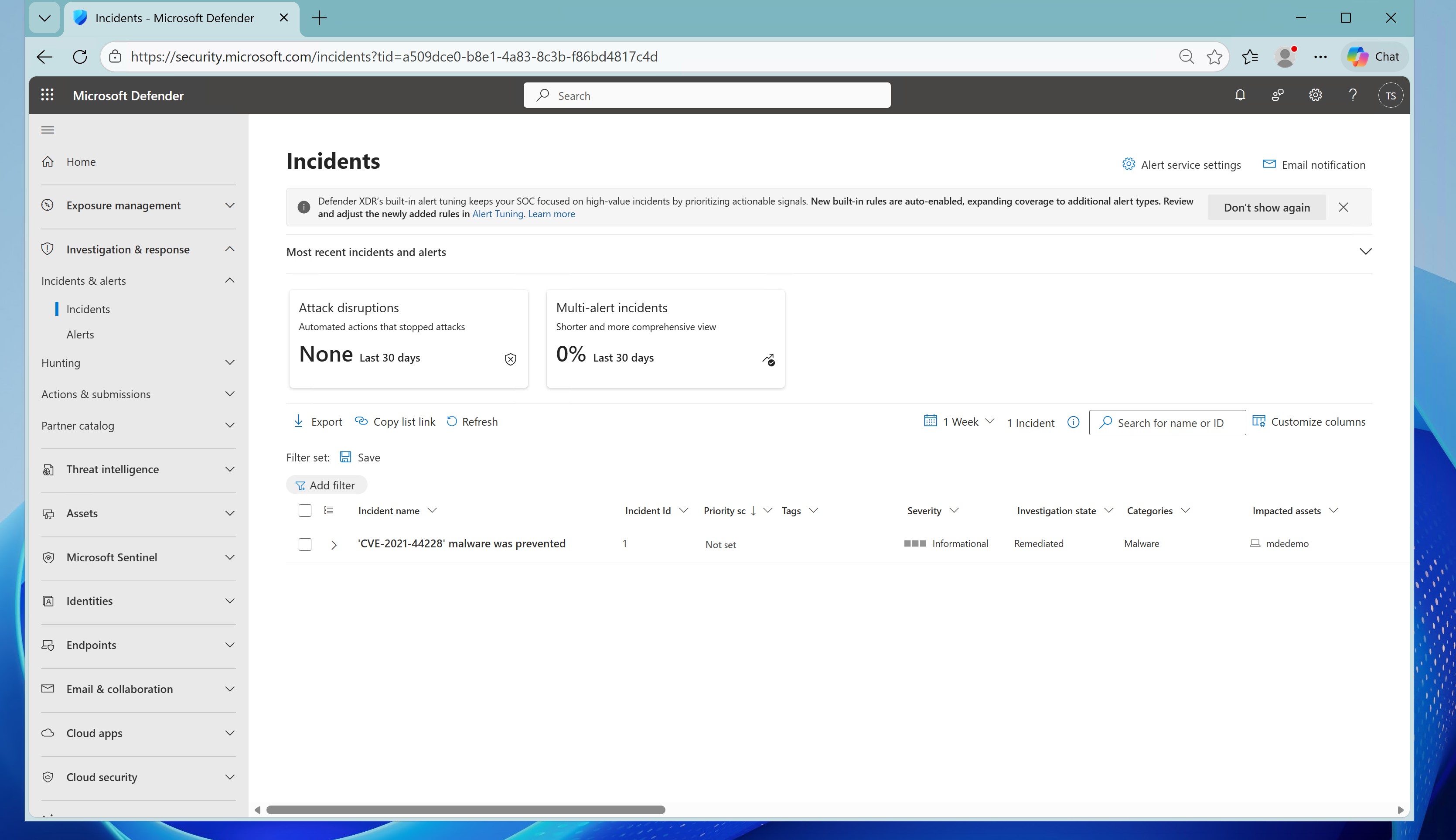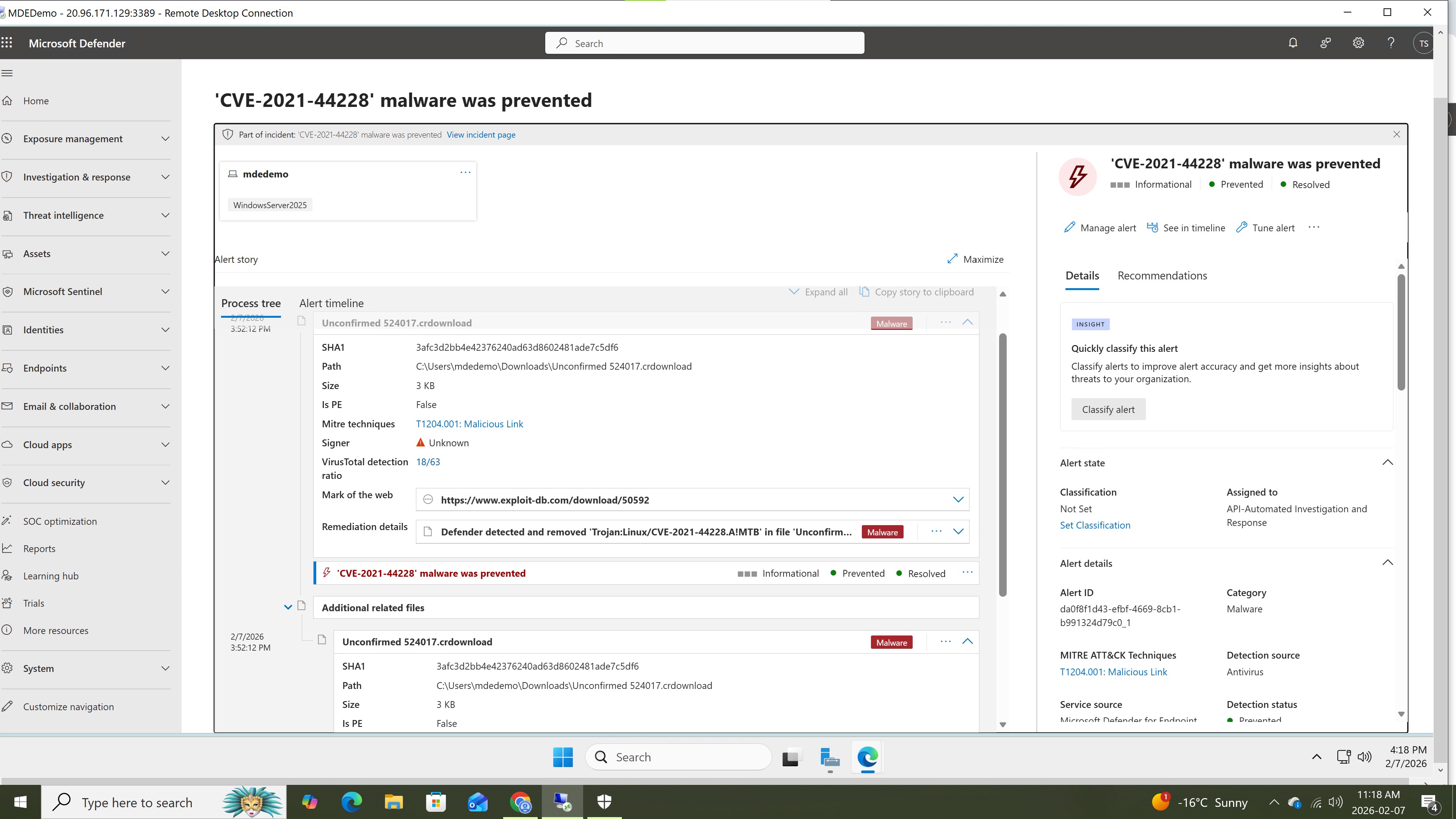 1. 在 Microsoft Defender 中触发告警,表明已阻止恶意软件尝试