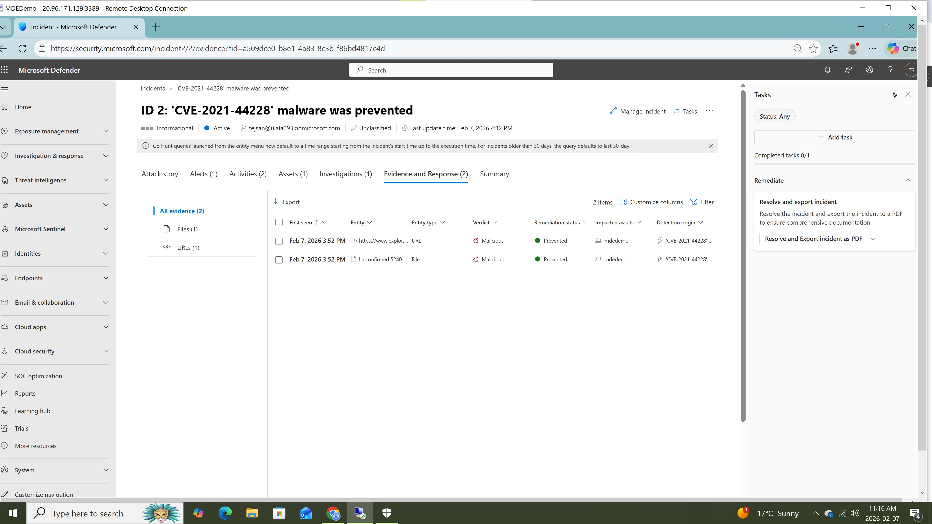 一个基于 Microsoft Defender XDR 的 SOC 实验室,演示从凭证访问攻击到检测、调查、响应与 IOC 阻断的完整流程。