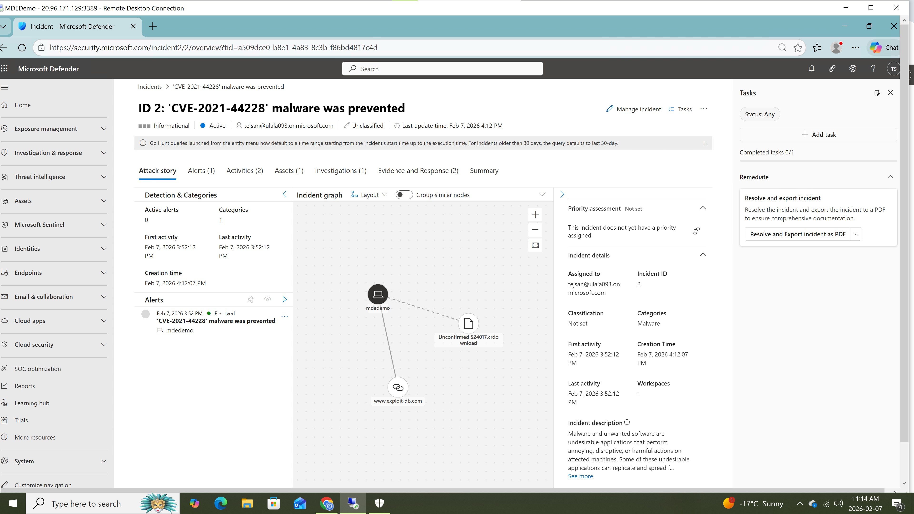 2. 在 Defender XDR 中打开事件以查看告警详情和受影响端点