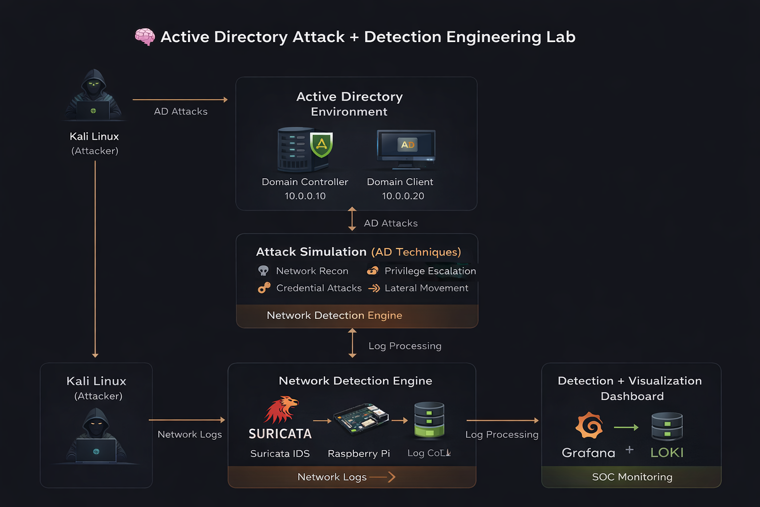 本项目演示了完整的 **Active Directory 攻击生命周期**,并结合 **Suricata、Raspberry Pi 和 Grafana** 进行 **检测工程与基于网络的监控**。