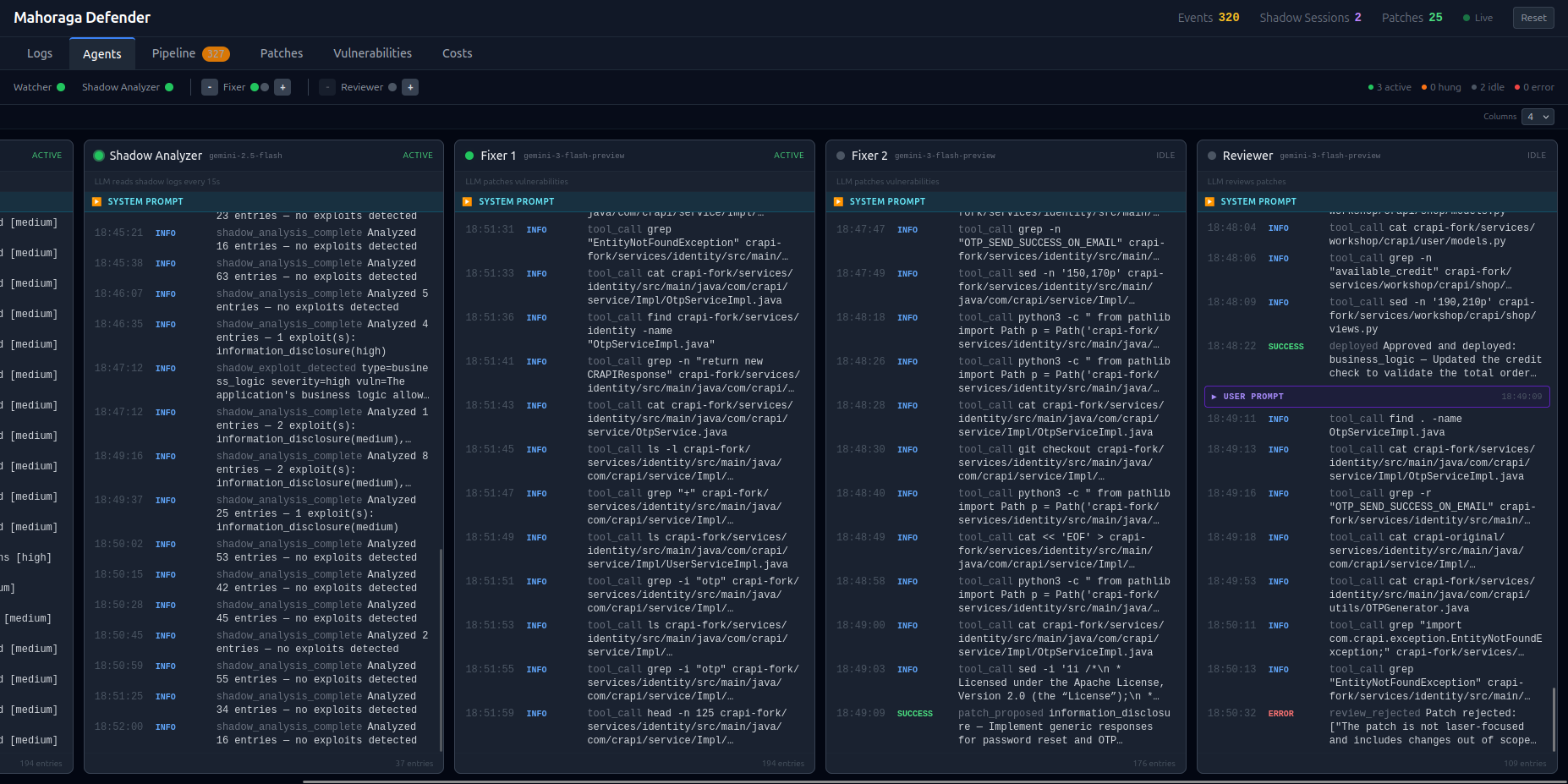 基于多 LLM Agent 协作的实时 Web 应用自主防御系统,通过影子环境隔离攻击者并自动检测、分析、修补代码漏洞。
