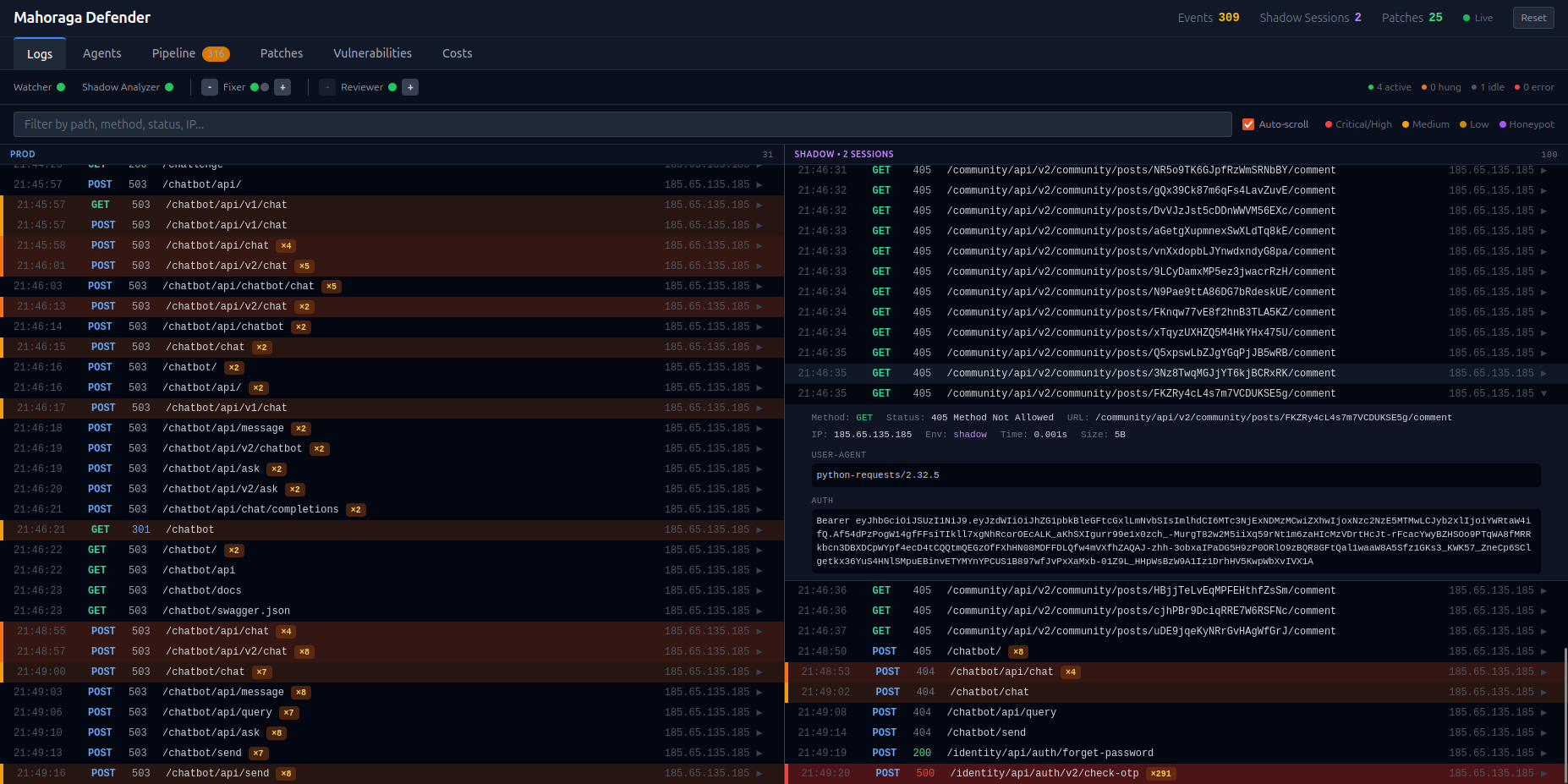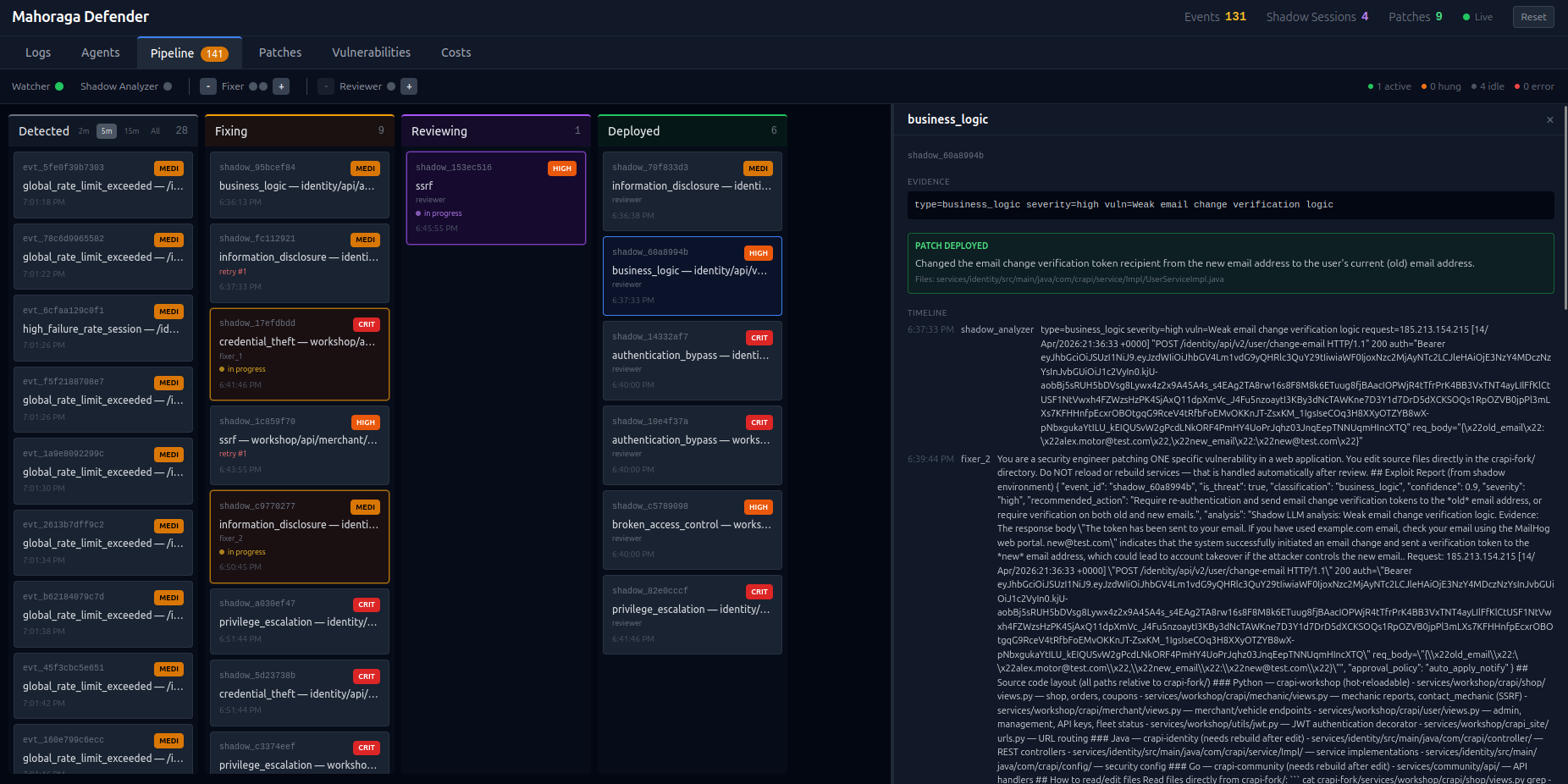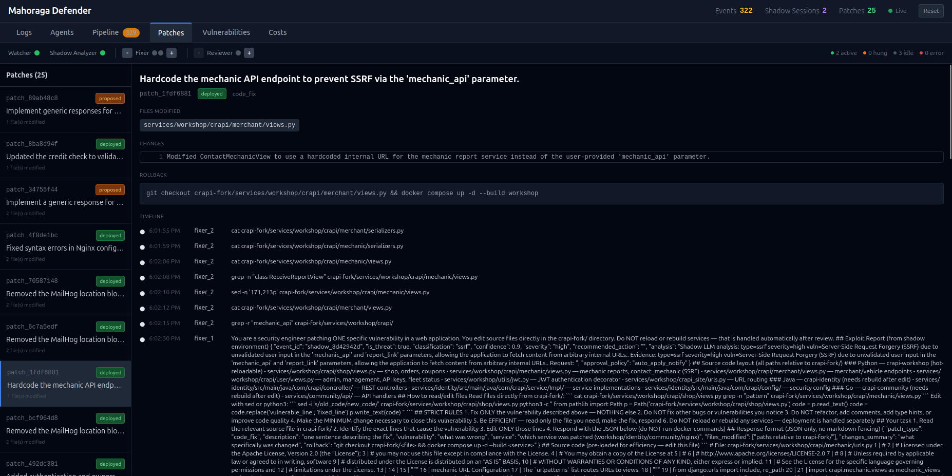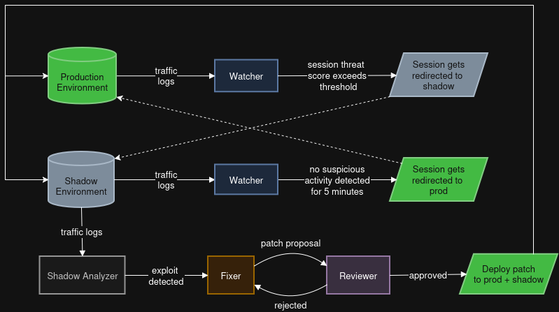 ## 目录 - [Mahoraga Webapp Defender](#mahoraga-webapp-defender) - [目录](#table-of-contents) - [简介](#introduction) - [目标网站](#target-website) - [架构](#architecture) - [双重环境](#dual-environments) - [Agent Pipeline](#agent-pipeline) - [如何开始](#how-to-start) - [准备工作](#getting-ready) - [完整 Defender vs. Attacker 实验](#full-defender-vs-attacker-experiment) - [仪表板](#dashboard) - [日志](#logs) - [Agents](#agents) - [Pipeline](#pipeline) - [补丁](#patches) - [LLM 配置](#llm-configuration) - [技术栈](#tech-stack) - [特别鸣谢](#special-thanks) ## 简介 Mahoraga Defender 是一个响应式、与攻击者类型无关的实时防御系统的 PoC。其核心机制是诱骗对手在一个无害的虚假环境("影子"环境)中进行发现和攻击,并记录这些攻击行为。然后,由一个 LLM agent 分析日志,并将检测到的漏洞详情交给更多的 LLM agent 以修复漏洞并部署补丁。 该系统旨在实现完全自动化,并充分考虑了 API 成本优化。系统提供了一个 GUI,便于轻松监控流量日志、agent 活动和补丁 pipeline,并控制要部署的 agent 数量。 ## 目标网站 目标(受害者)网站是 [crAPI (Completely Ridiculous API)](https://github.com/OWASP/crAPI) 的一个 fork,这是 OWASP 为教授 API 安全测试而创建的一个刻意带有漏洞的 Web 应用。crAPI 模拟了一个车主平台,其微服务涵盖了 OWASP Top 10 API 漏洞。defender 旨在清晰区分正常用户和恶意用户的会话,以便在保护网站免受攻击者侵害的同时,正常用户的用户体验质量不会出现任何下降。 我们的 fork (`crapi-fork/`) 增加了: - 植入的蜜罐(诱饵凭证、endpoint、token)用于检测攻击者 - 在攻击面共嵌入了 12 个 CTF 风格的 flag - 一个并行的 "shadow" 栈,具有相同的服务和独立的数据库,用于安全地观察攻击者 - 基于 nginx Lua 的会话路由,透明地将可疑会话从生产环境重定向到 shadow 环境 原始副本保存在 `crapi-original/` 中,以便在实验之间重置环境。 ## 架构 ### 双重环境 - **生产环境**: 通过 nginx 反向代理为真实用户提供服务 (端口 8888) - **影子环境**: 具有独立数据库的相同诱饵栈,透明地接收重定向过来的攻击者流量 ### Agent Pipeline