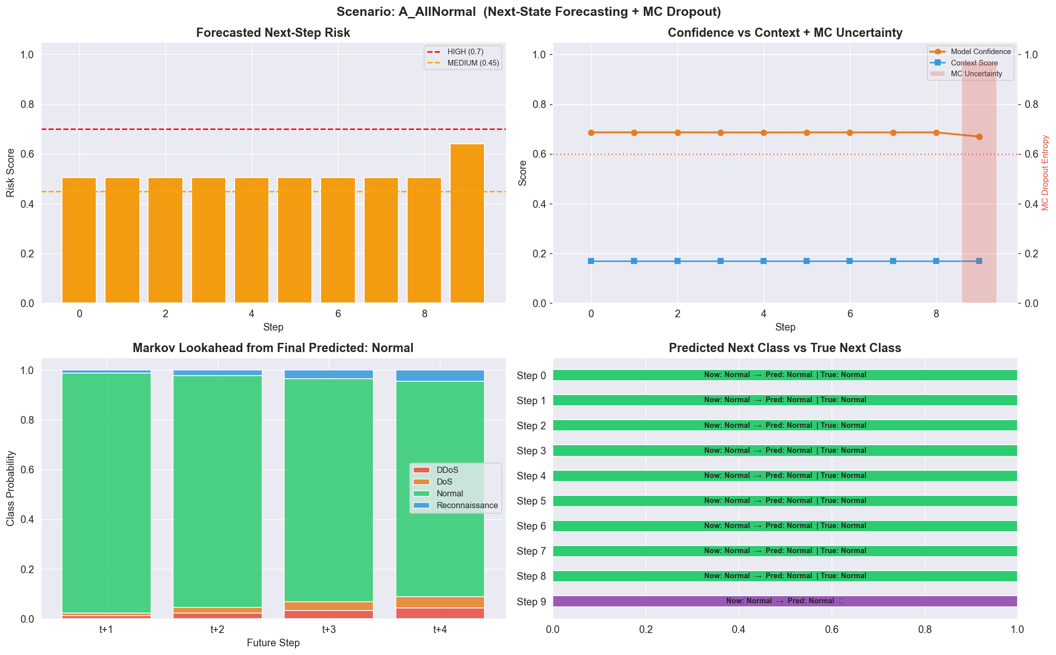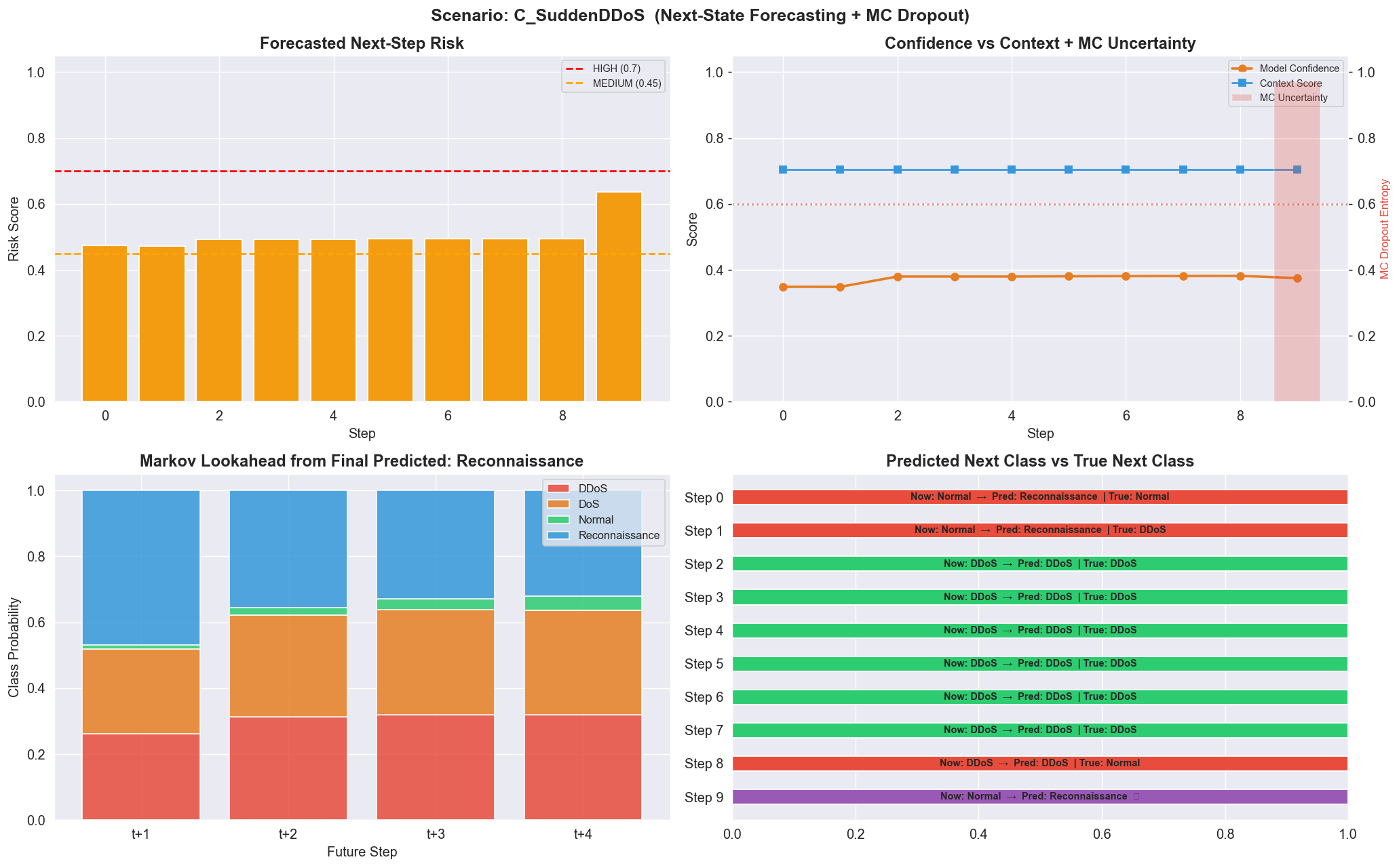 纯粹的神经网络预测会忽略领域知识。Markov 层融合了三种信号:经验状态转换、网络杀伤链升级先验(Normal → Recon → DoS → DDoS)以及实时上下文信号。
