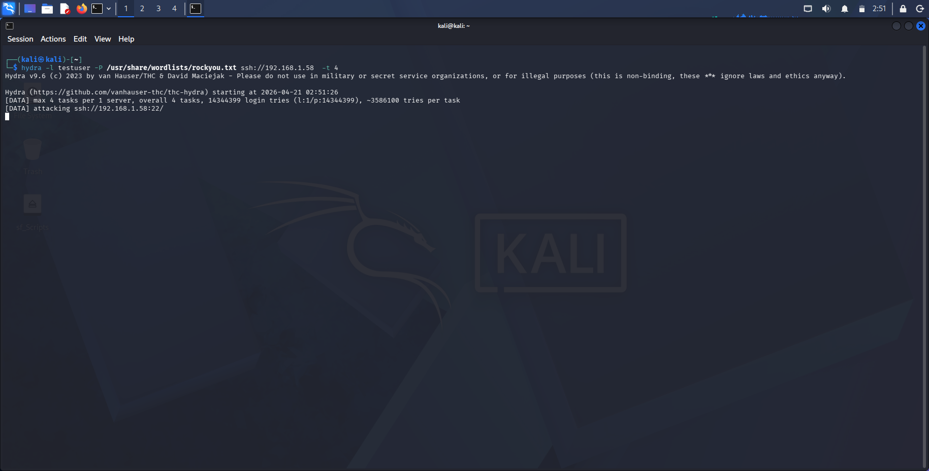 2. 从 Kali Linux 使用 `hydra` 发起字典攻击: