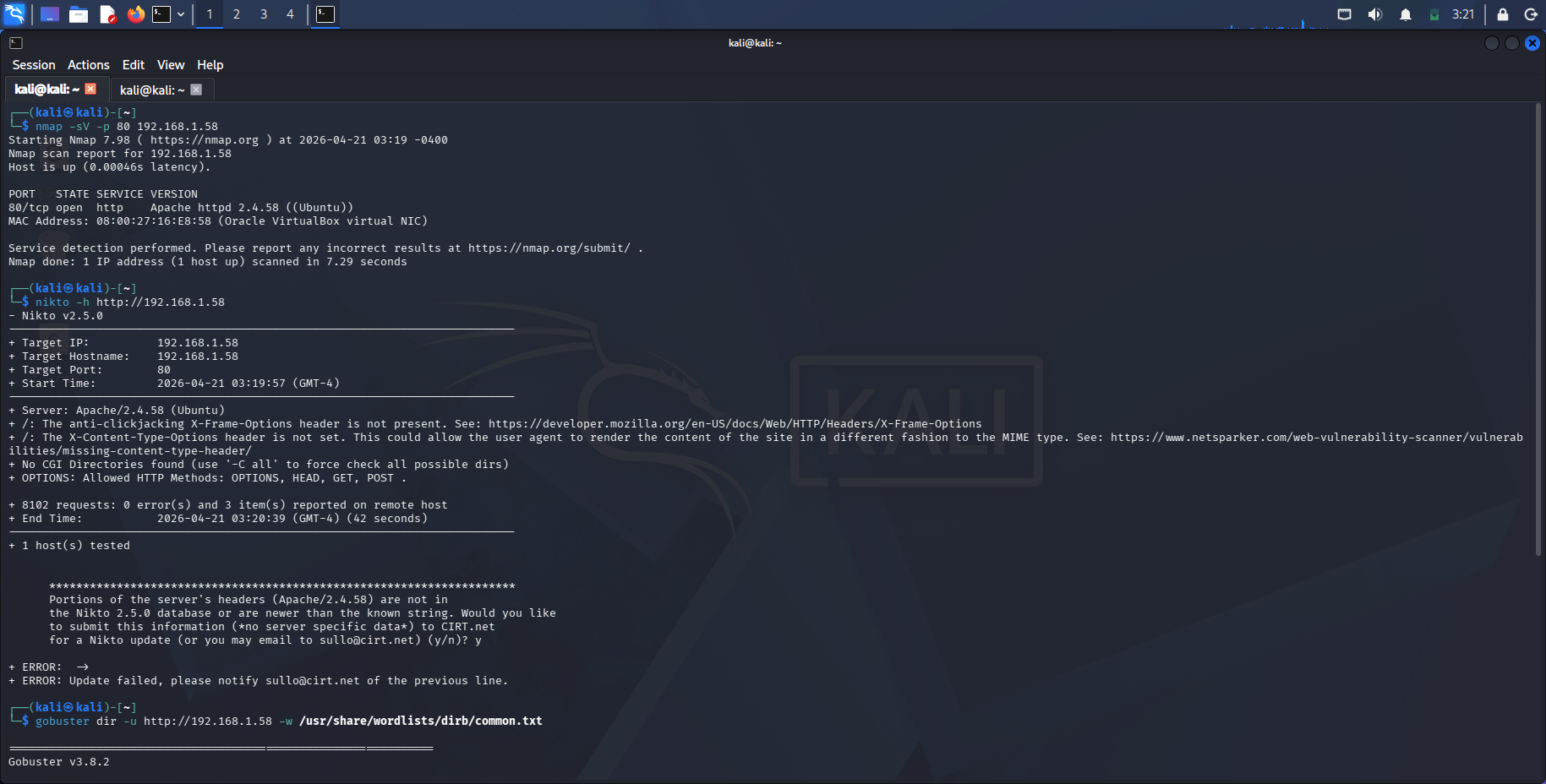 - **Gobuster:** `gobuster dir -u http:// -w /usr/share/wordlists/dirb/common.txt`