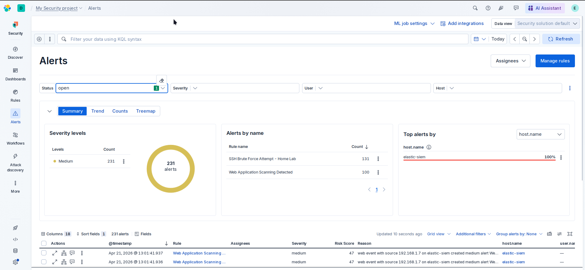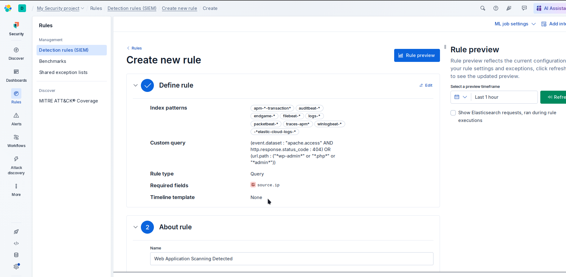 本项目搭建基于 Elastic Cloud SIEM 的家庭实验室环境,通过模拟 SSH 暴力破解和 Web 扫描攻击场景,实践从攻击复现到检测规则编写、警报验证的完整检测工程流程。