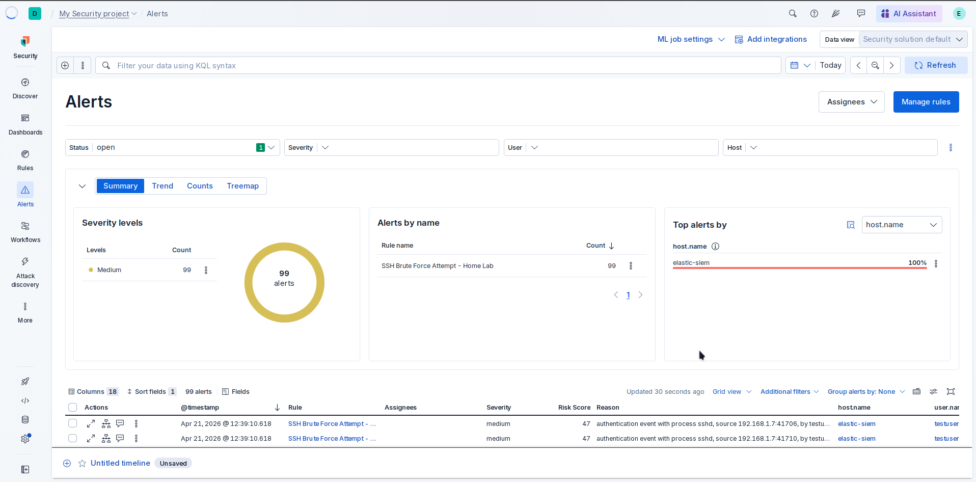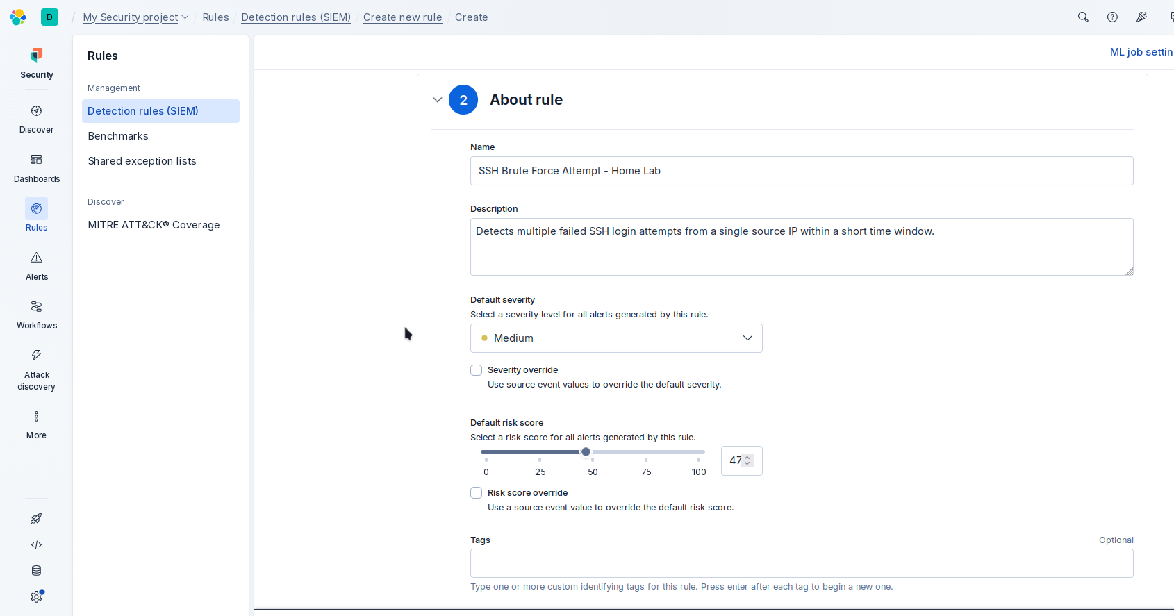 - **规则名称:** `SSH Brute Force Attempt - Home Lab`