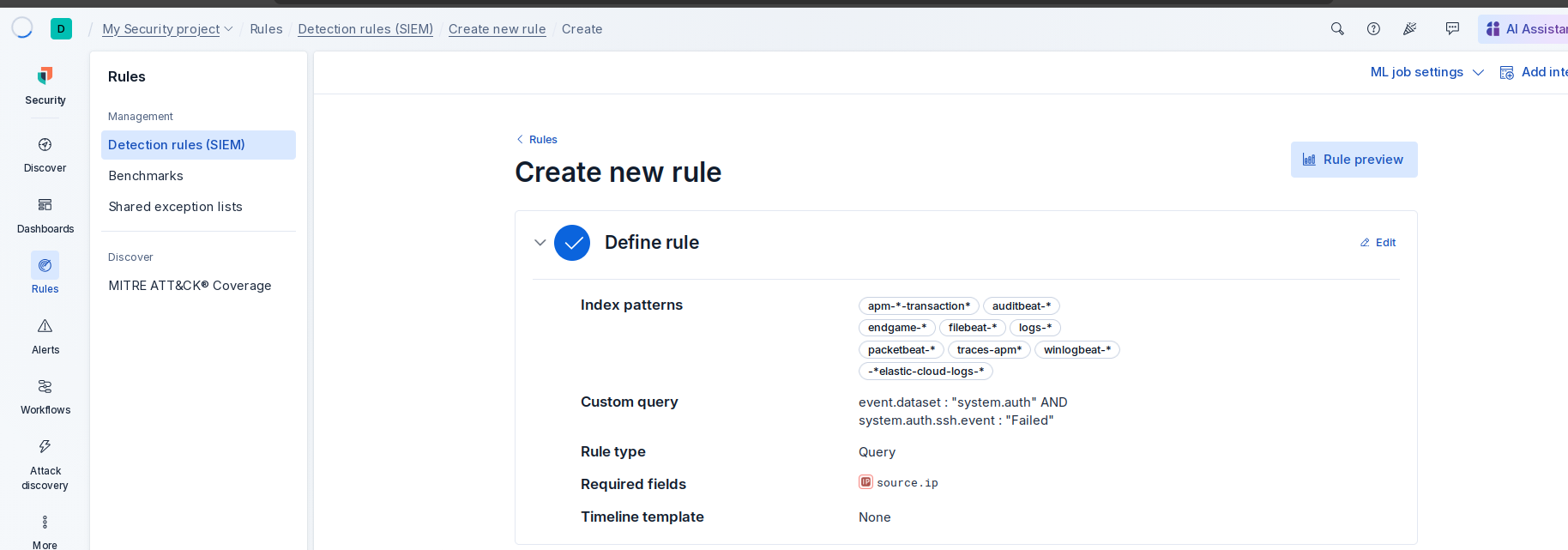 - **阈值:** 1 分钟内 > 5 次失败尝试,按 `source.ip` 分组