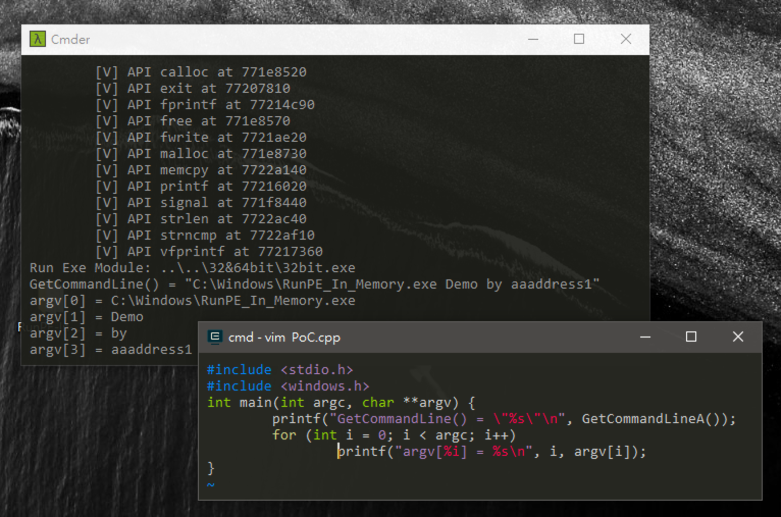 用法:`peLoader("path/to/exe/file", "arg1, arg2, arg3, ...")`