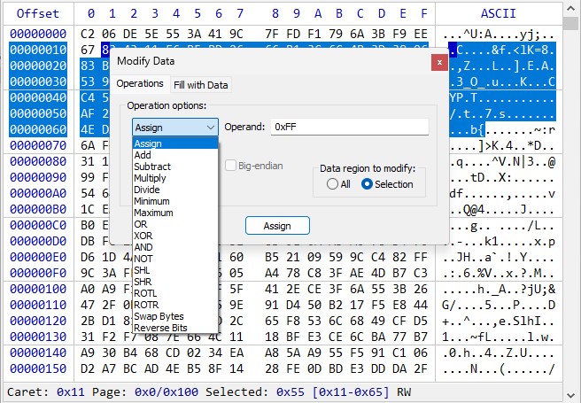 数据操作模式枚举,当 `HEXMODIFY::enModifyMode` 设置为 `MODIFY_OPERATION` 时,在 [`HEXMODIFY`](#hexmodify) 中使用。