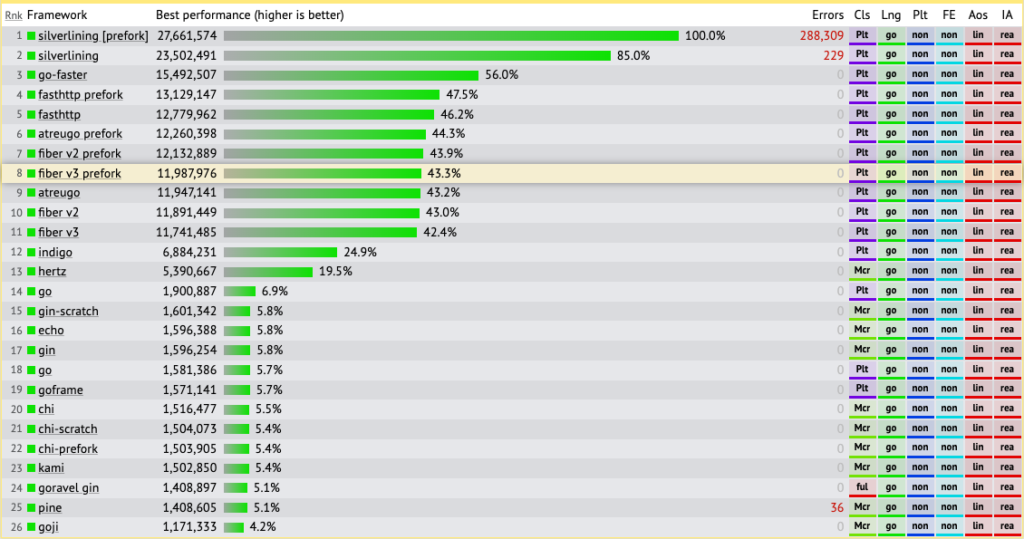 这些测试由 [TechEmpower](https://www.techempower.com/benchmarks/#section=data-r19&hw=ph&test=plaintext) 执行。如果您想查看所有结果,请访问我们的 [Wiki](https://docs.gofiber.io/extra/benchmarks)。
