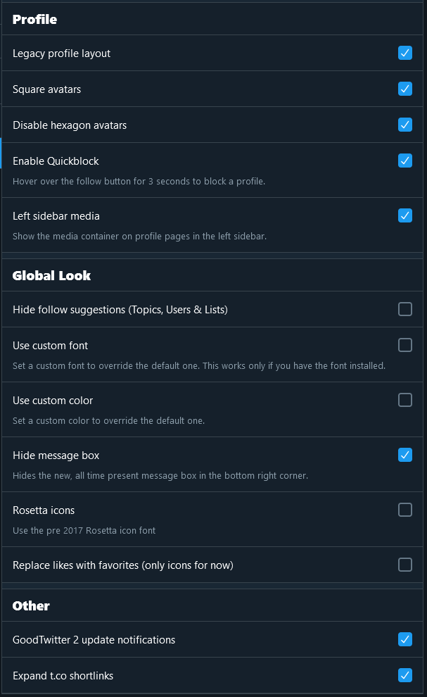 Twitter 于 2020 年 6 月 1 日完全禁用了旧的 2014 布局。这导致流行的扩展程序 [GoodTwitter](https://github.com/ZusorCode/GoodTwitter) [无法继续使用](https://twitter.com/ZusorOW/status/1258885451055800320)。但因为我更喜欢旧版布局,所以我决定创建这个脚本来以某种方式重现经典外观。