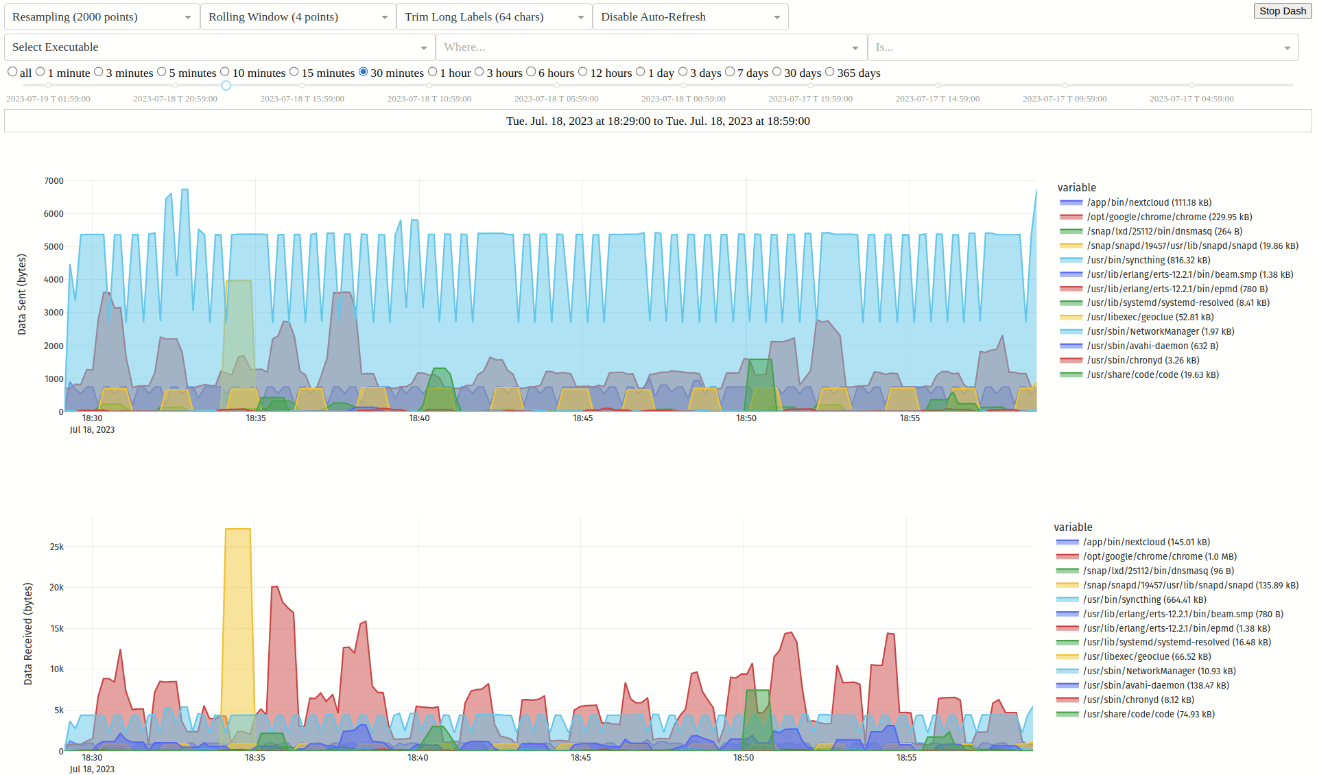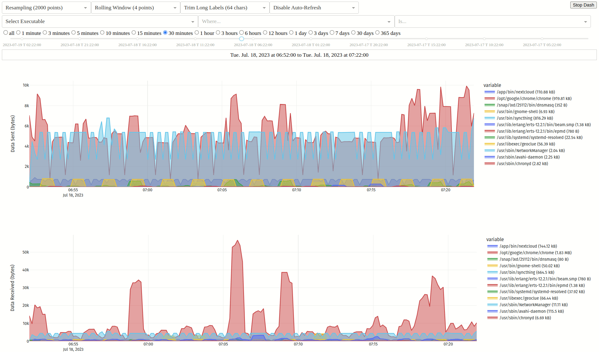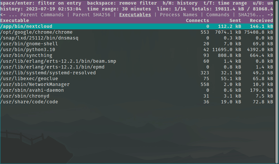 - 📈 监控您的带宽,按可执行文件、哈希值、父进程、域名、端口或用户随时间细分流量