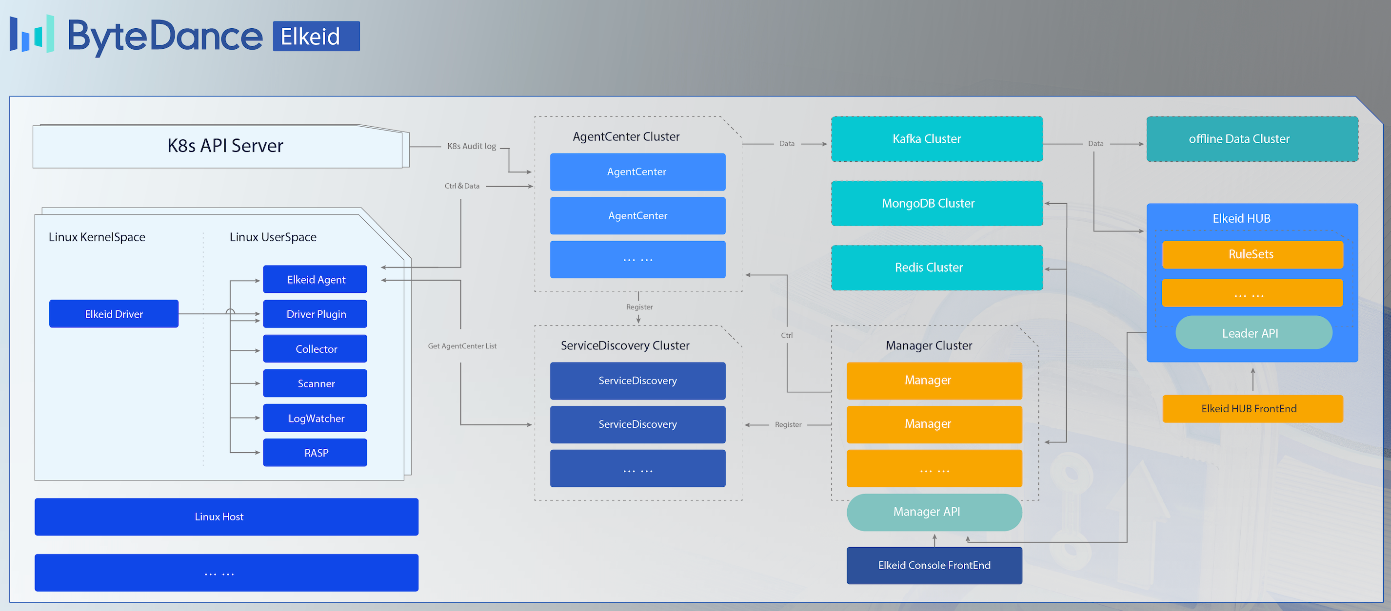 * **[Elkeid Driver](driver)** 驱动程序,可在 Linux 内核上收集数据,支持容器运行时,与 Elkeid Driver Plugin 通信。