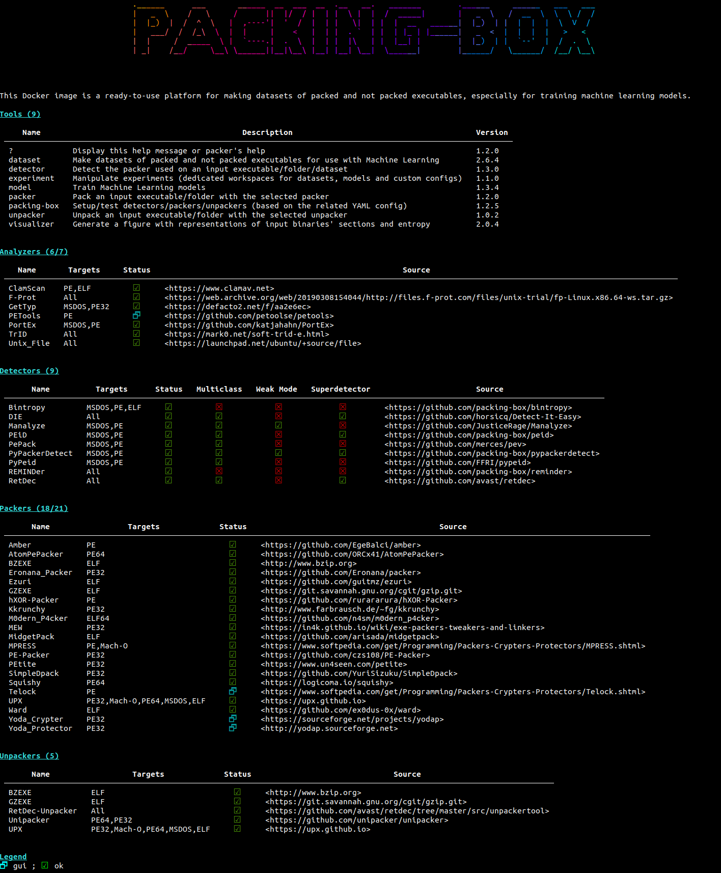 - [`packers.yml`](https://github.com/packing-box/docker-packing-box/blob/main/src/conf/packers.yml) 和 [`unpackers.yml`](https://github.com/packing-box/docker-packing-box/blob/main/src/conf/unpackers.yml): 不言自明