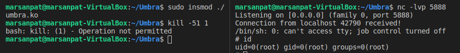 * 向任何 PID 发送信号 51。Umbra 会捕获它并启动 shell。