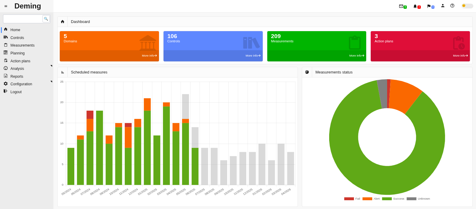**Deming** is open source software distributed under the [GPL](https://www.gnu.org/licenses/licenses.html) license. Contribute, improve and participate in securing information systems worldwide!标签:CISO, ffuf, GRC, ISMS, ISO/IEC 27001, meg, 二进制发布, 信息安全, 信息安全管理, 决策支持, 合规管理, 安全治理, 开源工具, 持续改进, 控制有效性, 测试用例, 监控报告, 管理系统