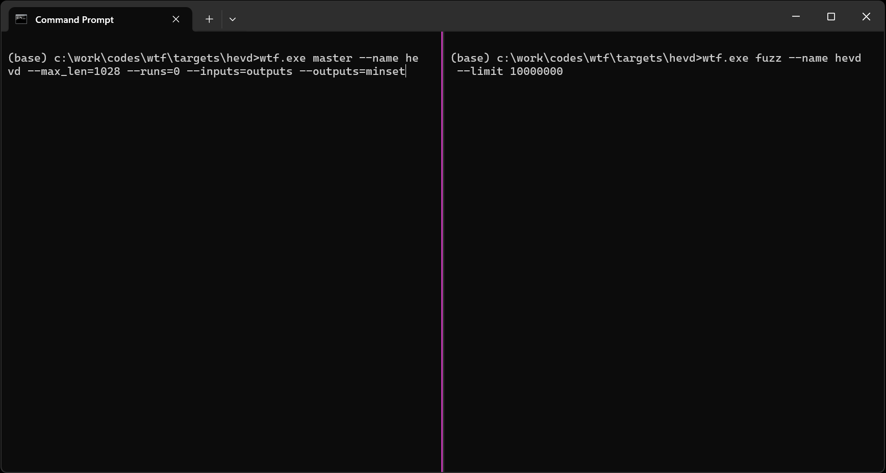 wtf.exe master --name hevd --max_len=1028 --runs=0 --inputs=outputs --outputs=minset