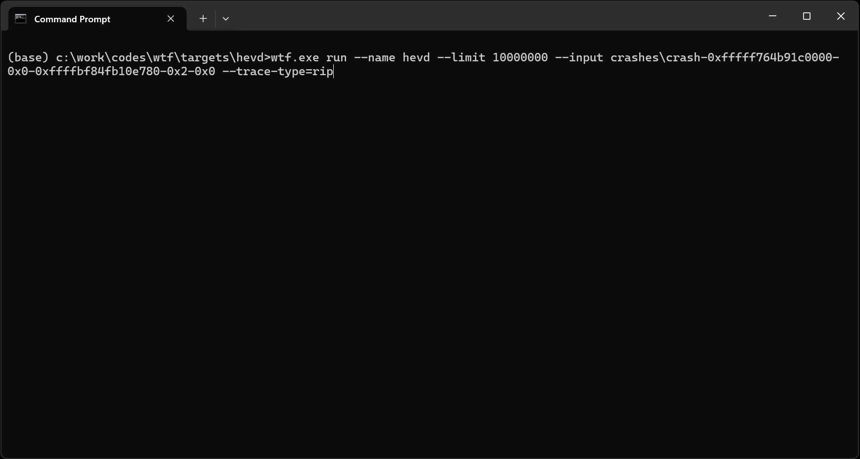 wtf.exe run --name hevd --limit 10000000 --input crashes\crash-0xfffff764b91c0000-0x0-0xffffbf84fb10e780-0x2-0x0 --trace-type=rip