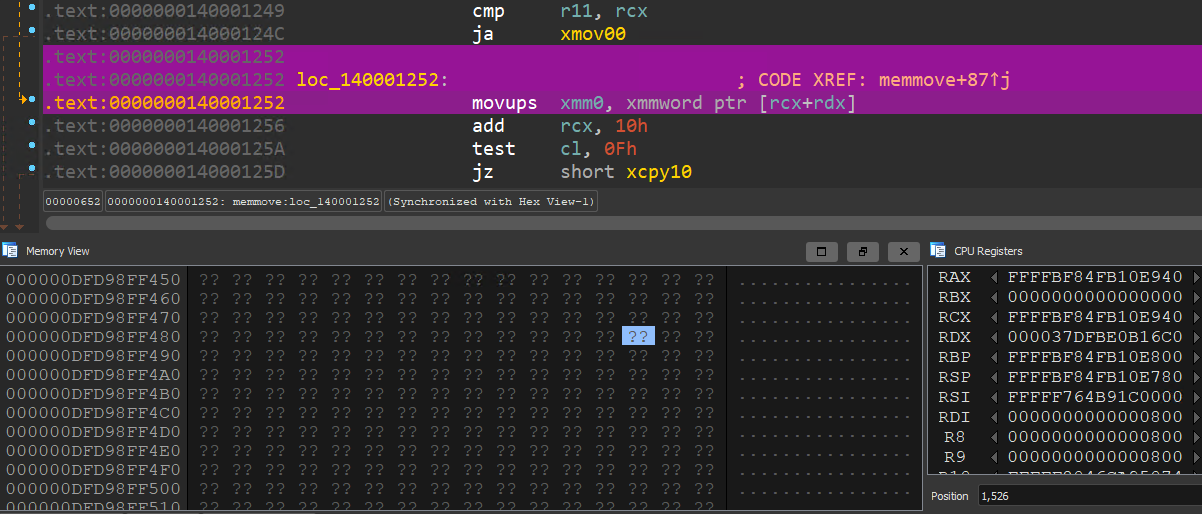 如果你发现自己需要更多的上下文感知能力,*bochscpu* 后端允许你生成可以加载到 [Tenet](https://github.com/gaasedelen/tenet) 跟踪浏览器中的执行跟踪。在下面的内容中,我从 `memmove` 中的一个崩溃开始,并回溯以找出源指针的来源(用户模式!):
