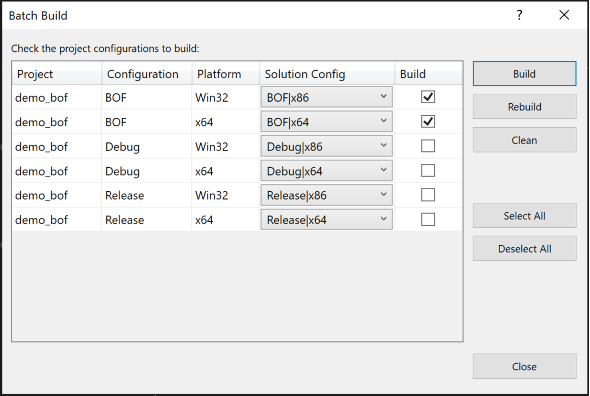 当代码准备就绪后,可以使用项目模板中的预定义构建配置一次性构建 x64 和 x86 BOFs。为此,请转到 Build -> Batch Build 并勾选这两种架构。