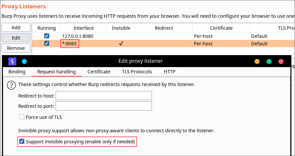 您需要指定位于与运行 Flutter 应用设备同一网络中的 Burp Suite 代理服务器的 IP。然后在 `BurpSuite -> Listener Proxy -> Options tab` 中配置代理: