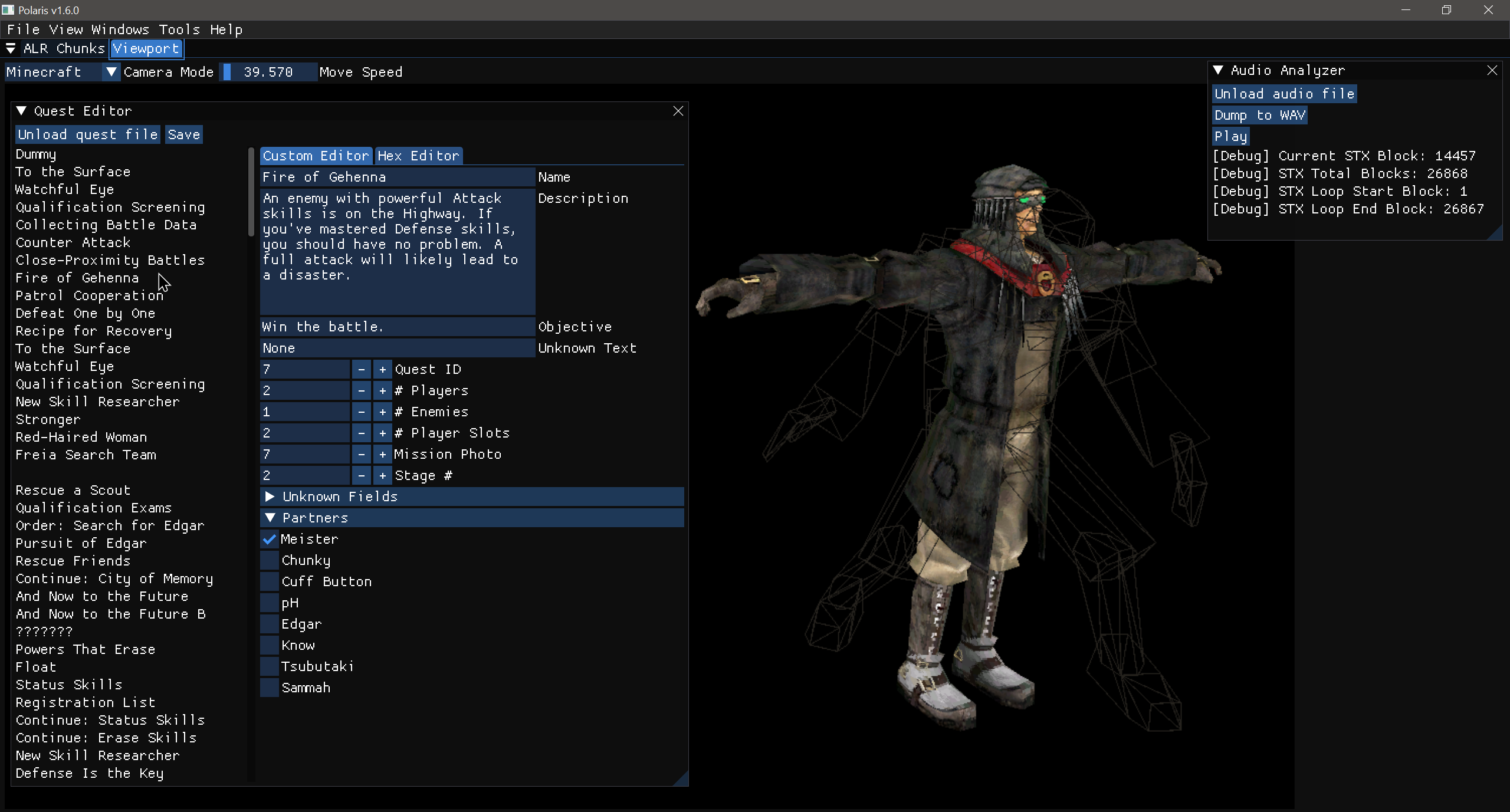 这是本仓库的主程序,一个用于 ALR 文件的图形化编辑器。它能够理解(程度各异)ALR 中的纹理、网格、动画和骨骼数据。Polaris 旨在取代用于 ALR 修改的普通十六进制编辑器,同时不牺牲灵活性。几乎每个窗口中都内置了微型十六进制编辑器,因此你可以快速跳转到所需的数据(并仅查看该数据)。