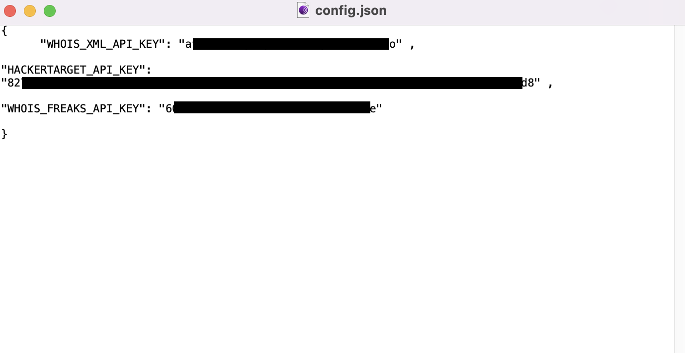 # API 密钥 🔑 在 `Config.json` 文件中,只需将你的 API 密钥粘贴到引号 `"API Key"` 内(见下图) - 购买 **Hacker Target** API 密钥**不是必须的**,你可以保持现状,只需在每次工具询问你是选择免费搜索还是使用 API 密钥搜索时,输入 `-F` 选择免费搜索即可。 - 获取 **WhoisXML** API 密钥是**必须的** ✅,这是免费的(`500 次免费搜索`),只需前往 WhoisXML 网站注册账户即可获取你的 API 密钥:(https://whois.whoisxmlapi.com) - 获取 **WhoisFreaks** API 密钥也是**必须的** ✅,这是免费的(`100 次免费搜索`),只需前往 WhoisFreaks 网站注册即可获取你的 API 密钥:(https://whoisfreaks.com),顺便说一句,一旦你用完了这 100 次免费搜索,你可以仅以 19.00$ USD 的价格购买 5000 次 API 调用