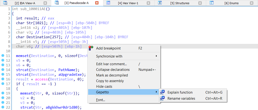 Gepetto 是一个 Python 插件,它使用各种大型语言模型为 IDA Pro(≥ 7.6)反编译的函数提供语义解释。它可以利用这些模型来解释函数的功能,并自动重命名其变量。以下是一个简单的示例,展示了它在短短几秒钟内就能提供的效果:
