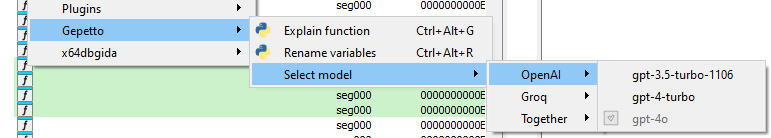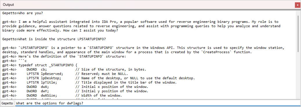 Gepetto 还提供了一个 CLI 接口,您可以使用它直接从 IDA 中向 LLM 提问。请确保在输入栏中选择 `Gepetto`: