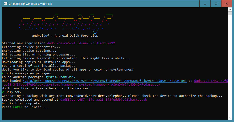 现在 androidqf 应该正在执行,并在您放置 androidqf 二进制文件的相同路径下创建一个取证文件夹。在执行过程中的某个时刻,androidqf 会提示您进行一些选择:这些提示将暂停取证过程,直到您提供选择,因此请注意。