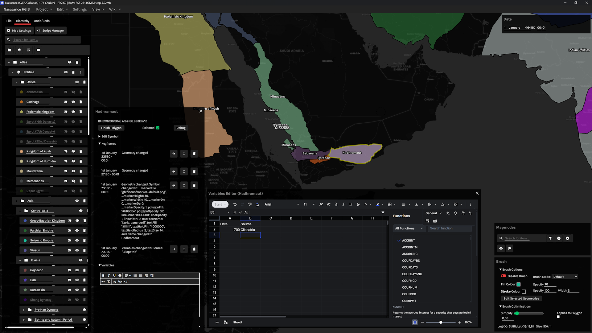 - Atlas:(矢量)- 公元前3000年至公元2023年的政权数据,基于 [Cliopatria](https://www.nature.com/articles/s41597-025-04516-9),目前正在手动清理。解释器脚本可在 SVEA 的 `livemap` 文件夹中找到,清理后的多边形位于 `saves/atlas.naissance`。