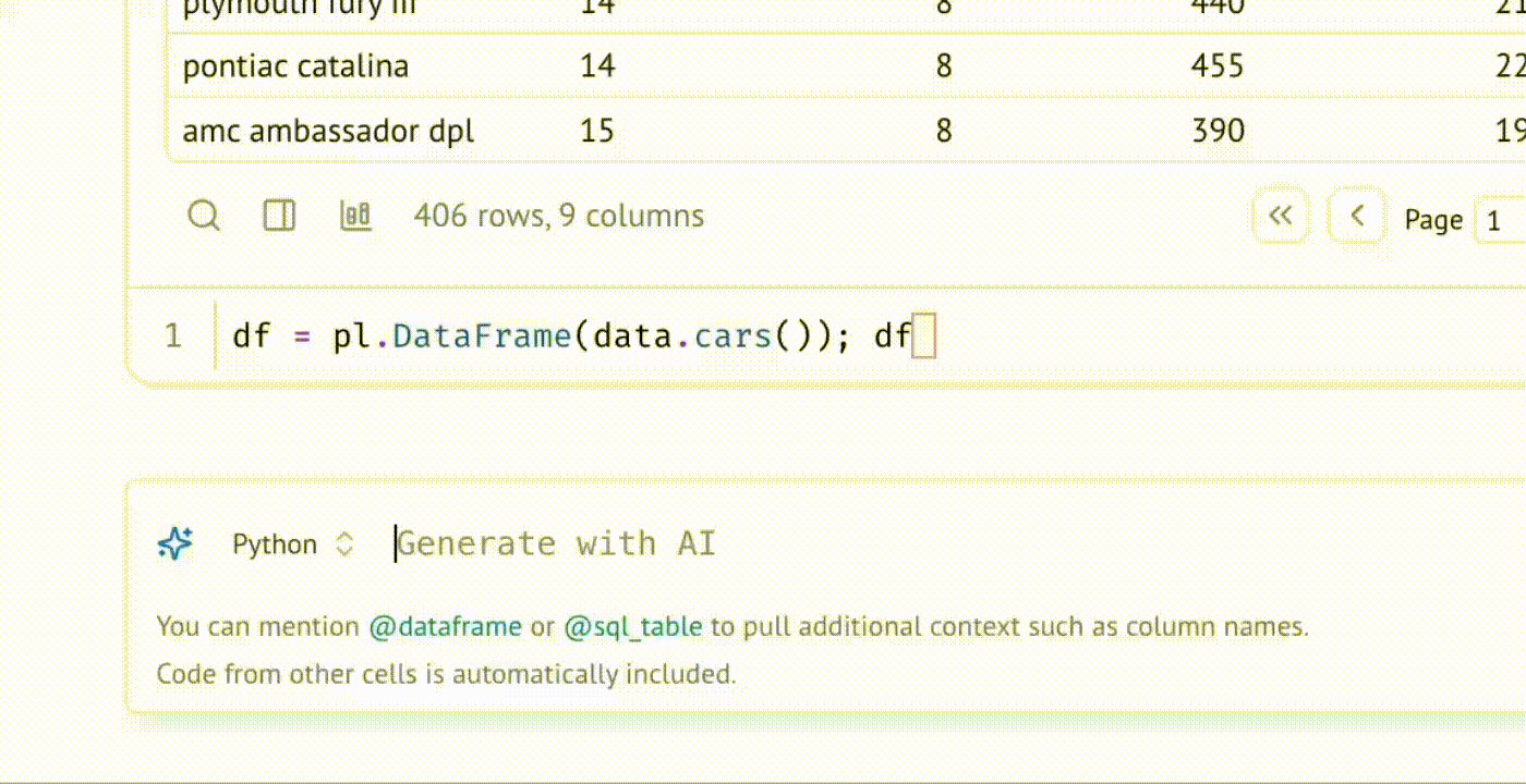 **通过数据感知 AI 生成单元格。** 使用您喜爱的 agent(如 Claude Code、Codex 或 OpenCode)通过 [marimo pair](https://docs.marimo.io/guides/generate_with_ai/marimo_pair/) 在 marimo notebook 上协作。或者,在 marimo 编辑器中使用 [AI 助手](https://docs.marimo.io/guides/editor_features/ai_completion/) 生成代码,该助手专门针对数据处理进行了优化,并了解内存中变量的上下文。自定义系统提示词,自带 API 密钥,或使用本地模型。